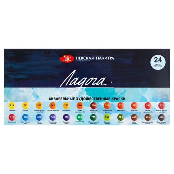 Профессиональные художественХудожественные акварельные краски «Ладога» разработаны для решения творческих задач учащихся профессиональных образовательных учреждений. Рекомендованы для создания этюдов, эскизов, учебных и дипломных работ. Применяя в ежедневной работе акварель «Ладога» будущие мастера живописи изучат основные изобразительные приемы и техники, цветоведение и цветовые гармонии. Тонкодисперсные акварельные краски «Ладога» выпускаются с применением современных синтетических пигментов и традиционного связующего - натурального гуммиарабика, признанного лучшей растительной смолой для приготовления художественных красок. Краски «Ладога» обладают яркими насыщенными цветами. Сбалансированная палитра набора 24 цвета составлена по рекомендациям педагогов художественных школ. Кюветы упакованы в фольгу и этикетку с полной информацией о красках. Набор представлен в пластиковом коррексе и выдвижном картонном чехле.