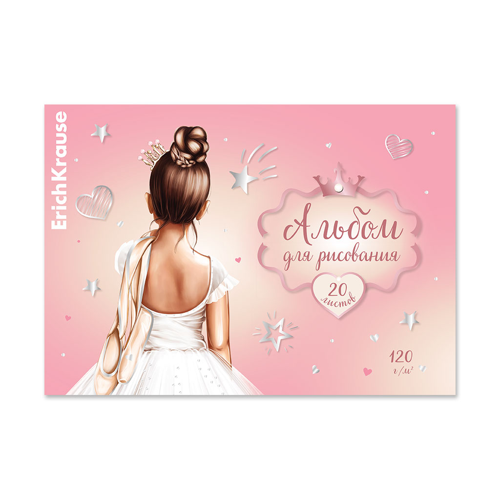 Альбом для рисования формата А4 (210х297 мм). Обложка из высококачественного мелованного картона плотностью 170 г/м2. Жесткая подложка 360 г/м2. В блоке 20 листов. Бумага плотностью 120 г/м2. Белизна бумаги - 100%. Тип скрепления - клей. Альбомы упакованы в термоусадочную пленку по 10 штук.