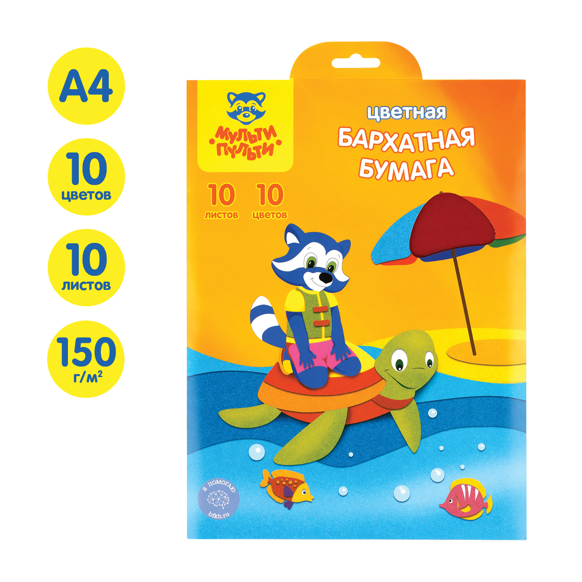 Набор цветной бархатной бумаги «Мульти-Пульти» серии «Приключения Енота» отлично подойдет для поделок и детского творчества. Бумага имеет размер 198*285 мм. Плотность бумаги формата А4 – 150 г/м2. В наборе представлено 10 цветов на 10 листах.