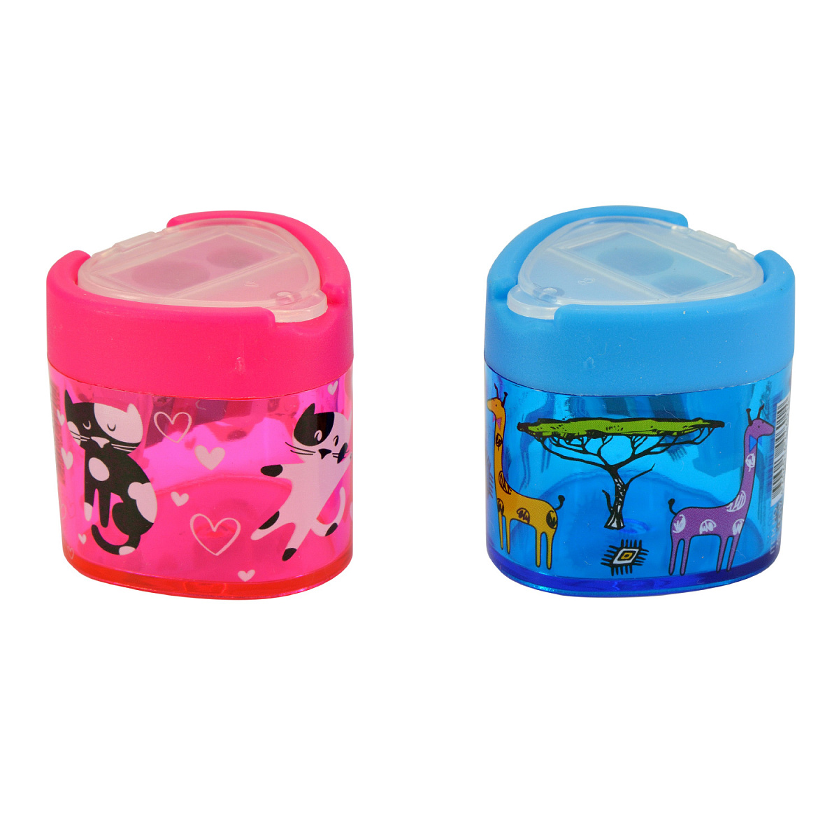 Детская точилка треугольной формы с контейнером для сбора стружки из коллекции "HappySharp". Качественная и удобная. Есть два отверстия, которые закрываются пластиковой крышкой, для заточки стандартных и утолщенных карандашей. Контейнер сделан из прозрачного пластика, так что ребенку легко контролировать его заполняемость и вовремя очищать. Точилка выполнена в двух цветовых решениях - розовом и голубом. Корпус украшен очаровательными принтами: кошки с сердечками и жирафы в саванне. В стандартной упаковке 12 шт. в картонном дисплее.