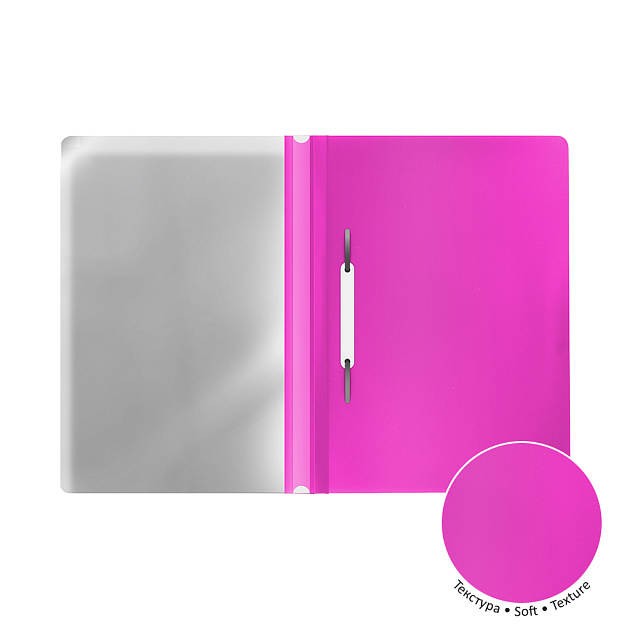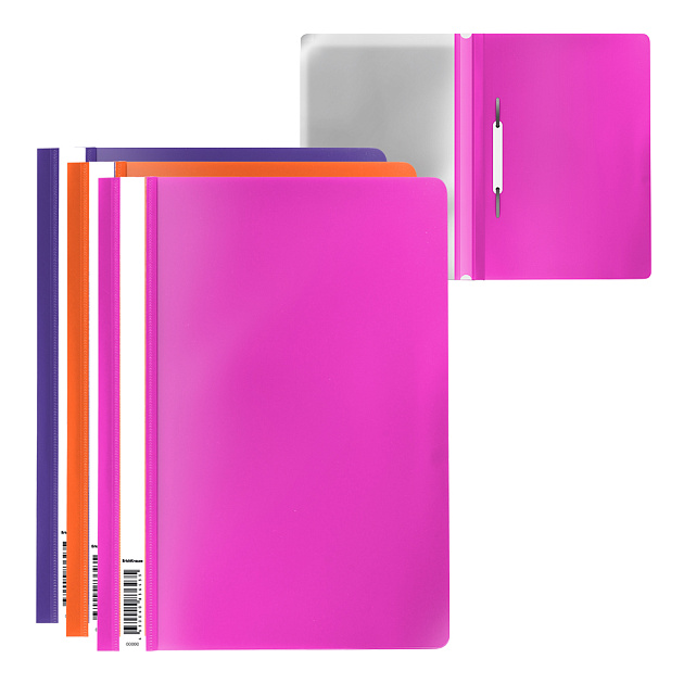 Папка-скоросшиватель формата А4 из высококачественного непрозрачного пластика с текстурой поверхности "софт-тач", на которой не видно отпечатков пальцев и мелких царапин. Предназначена для быстрого сшивания, хранения и просмотра документов. Цвет папки – ассорти: маджента, оранжевый, фиолетовый. Механизм - механический скоросшиватель; прозрачный верхний лист; усиленный пластиковый корешок с прозрачной полосой для информационной карточки. Папка вмещает до 130 бумажных листов. Размер - 312х230 мм, толщина верхнего листа - 0.12 мм, толщина нижнего листа - 0.18 мм. Код и баркод на каждой единице товара.