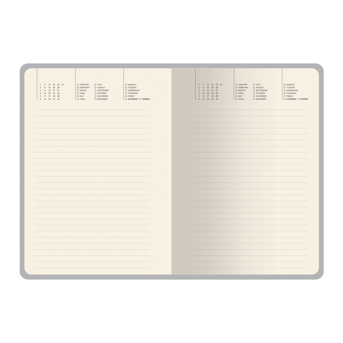 Внутренний блок изготовлен из бежевой бумаги плотностью 80 г/кв.м и содержит 128 листов в серую линейку.