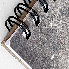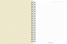Нижняя : переплетный картон толщиной 1,2 мм. Спираль сверху. Внутренний блок: офсетная печать, бумага 100% белизны, 65г/м2. Дизайн внутреннего блока "в клетку". Особенности: тиснение золотой фольгой.