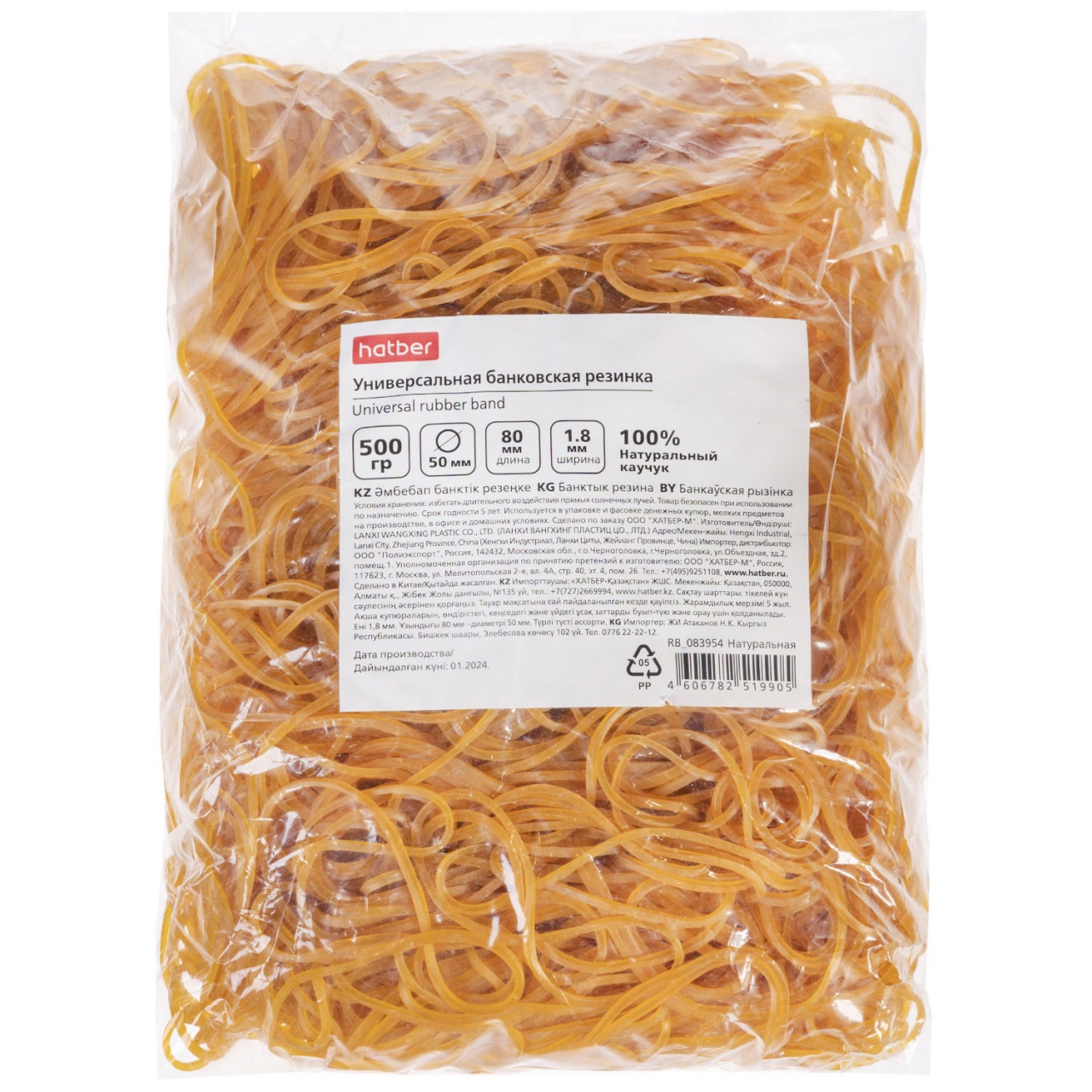 Резинка банковская 100% натуральная Hatber диаметр 50мм, длина  80мм, 500г в пакете