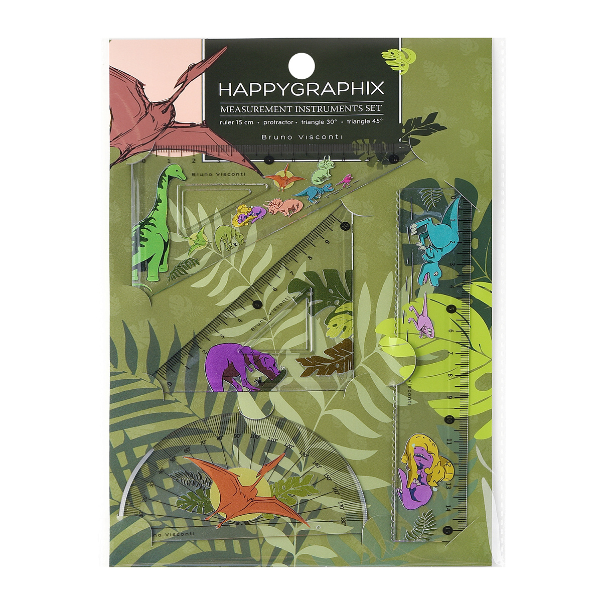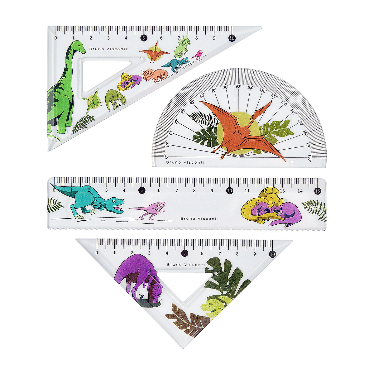 Набор измерительных инструментов из коллекции "Happy Graphix. Динозавры" ТМ Bruno Visconti прекрасно подойдет для использования на уроках математики в средней школе. В наборе: два треугольника на 30 и на 45 градусов, стандартная линейка с длиной разметки 15 см и транспортир. Все предметы выполнены в одном стилевом решении. Набор изготовлен из нетоксичного прозрачного пластика. Шкалы с разметками нанесены тиснением и не сотрутся. По измерительной стороне линеек есть фаски, так что их удобно прикладывать и удерживать на бумаге: линии получаются точными и четкими.