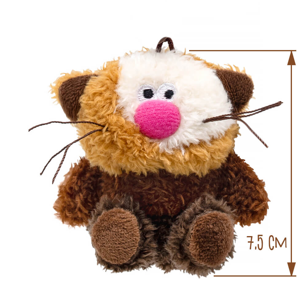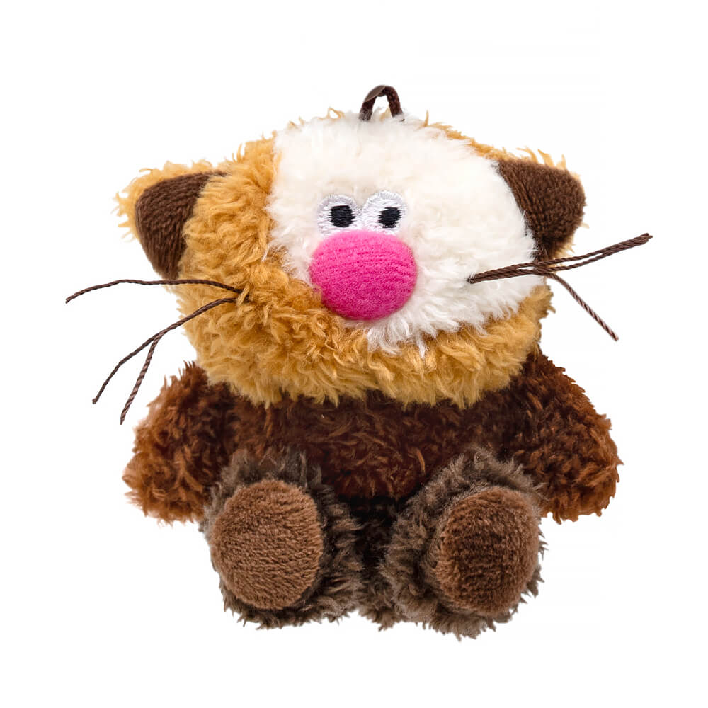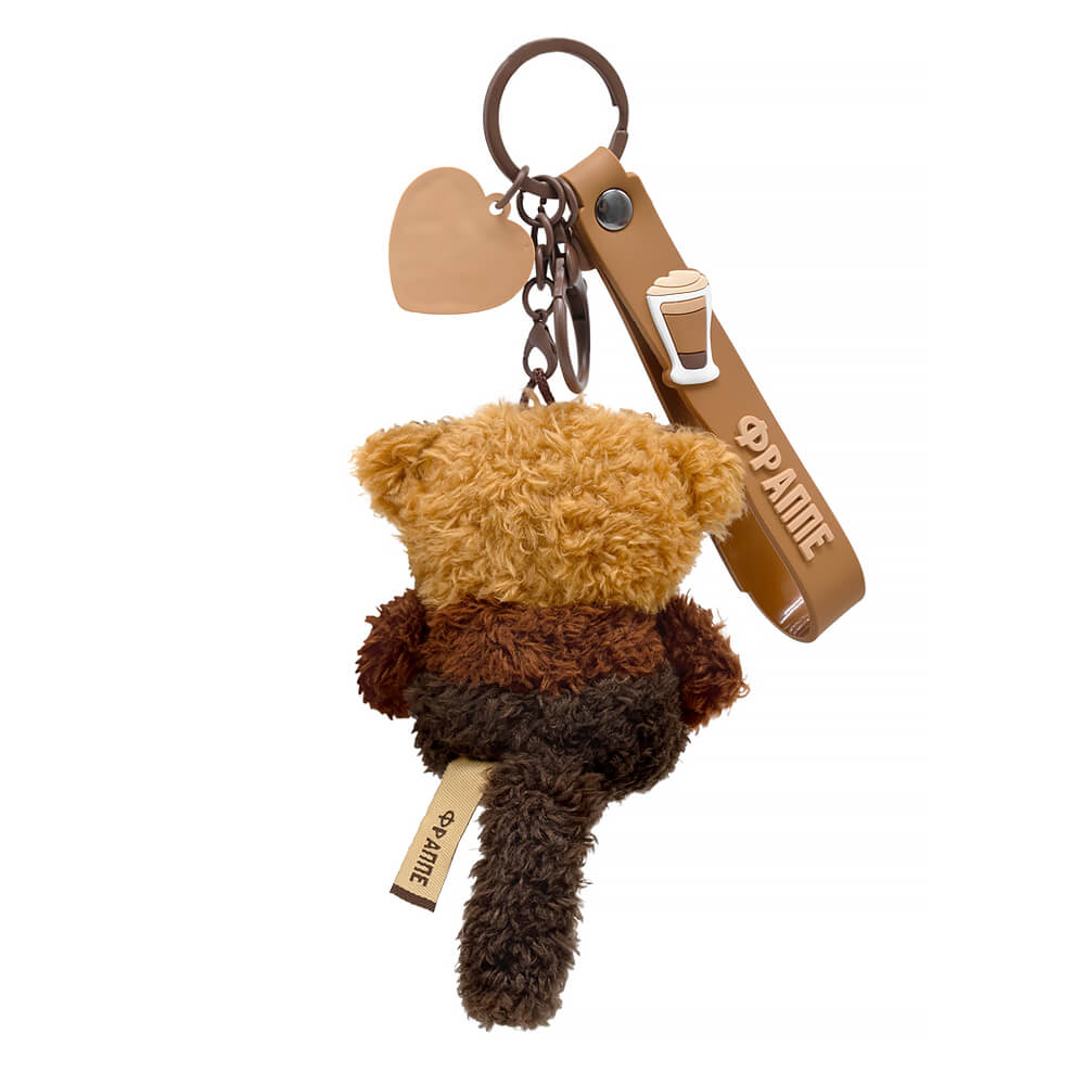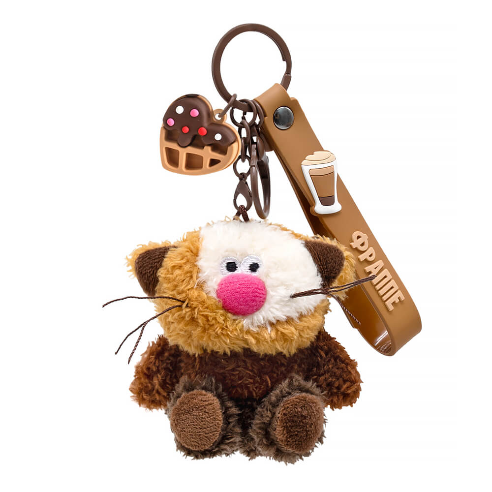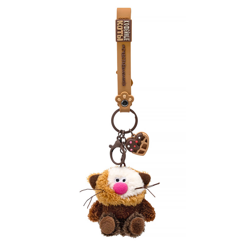 Кот брелок Фраппе. Брелок сшит из тактильно приятного эко меха в трех оттенках: цвета горького шоколада, цвета золотистой карамели и белоснежного цвета молочной пенки. Усики из шелковистого кручёного шнура. Объемный носик обтянут розовым софтом. Глазки вышиты. Пяточки и внутри ушек софт шоколадного цвета. Брелок крепится на кольцо шоколадного цвета с силиконовыми подвесами. Один подвес – это браслет с хештегом «счастьеВмоменте» на кнопке и с фирменным логотипом «Кофейные коты». Другой подвес – венская вафелька, политая шоколадом с посыпкой.