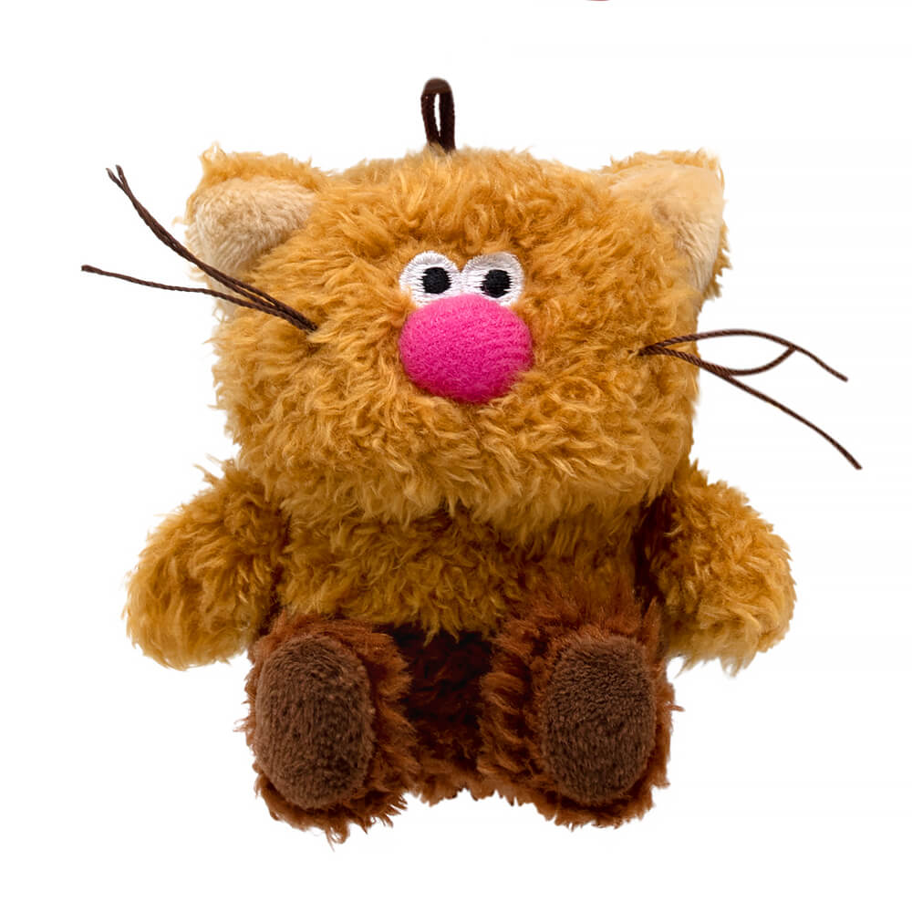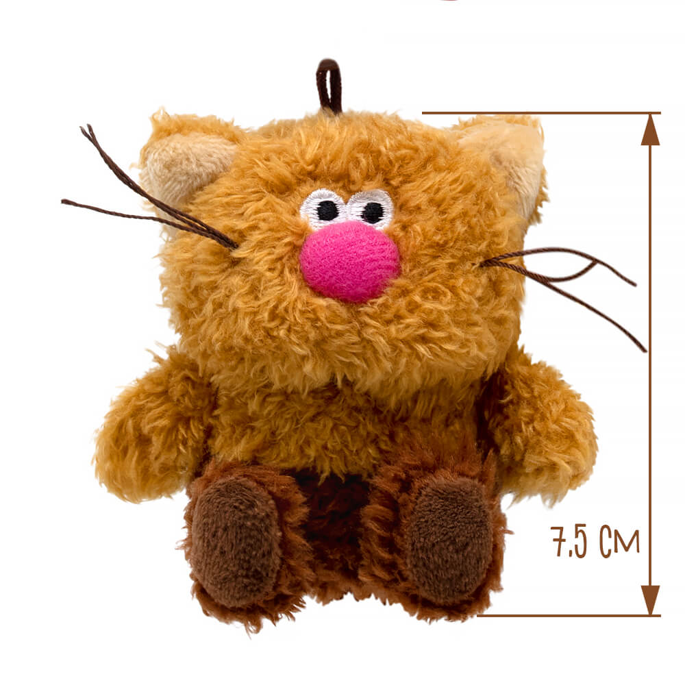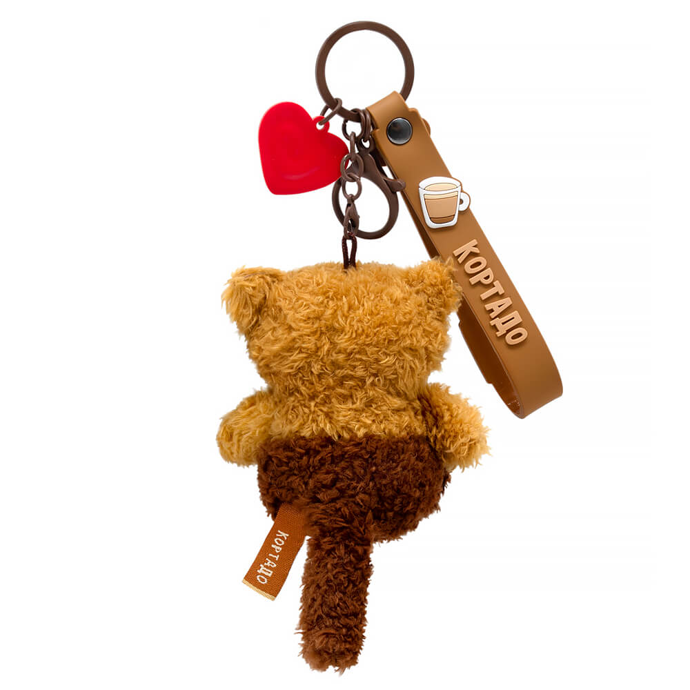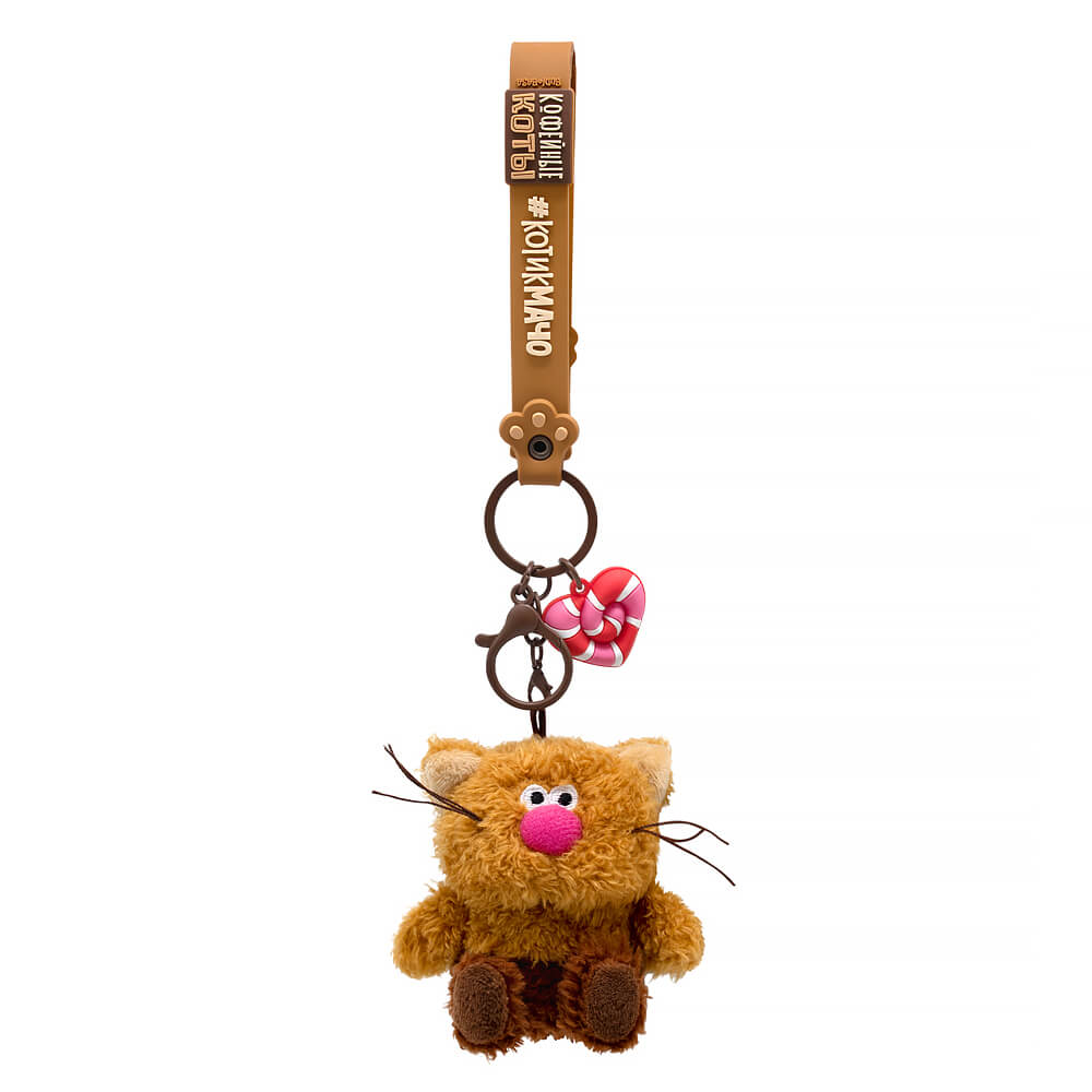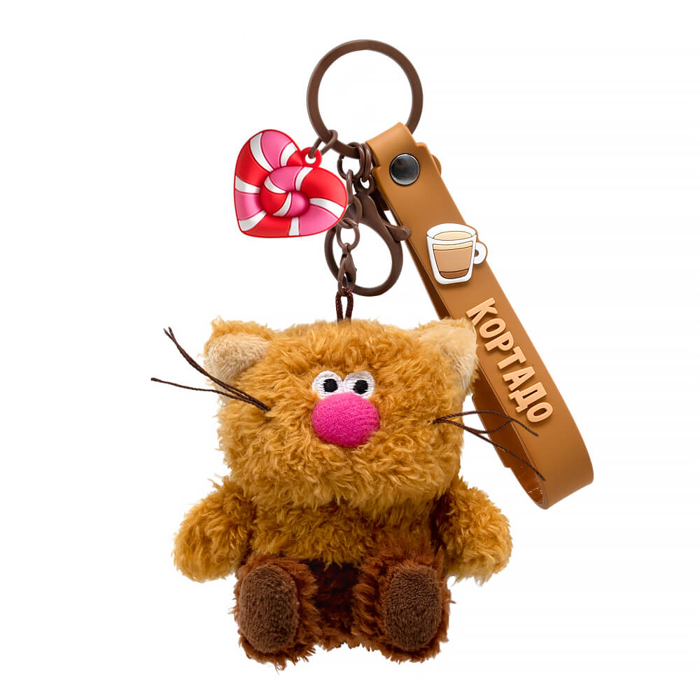 Кот брелок Кортадо. Брелок сшит из тактильно приятного эко меха трех оттенков коричневого цвета. Усики из шелковистого кручёного шнура. Объемный носик обтянут розовым софтом. Глазки вышиты. На пяточках вшит темно‑коричневый софт, а внутри ушек вшит молочный софт. Брелок крепится на кольцо шоколадного цвета с силиконовыми подвесами. Один подвес – это браслет с хештегом «КОТИКмачо» на кнопке и с фирменным логотипом «Кофейные коты». Другой подвес – карамель‑тянучка в виде сердечка.