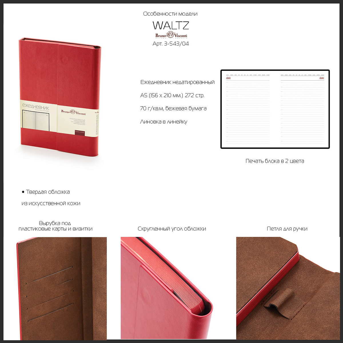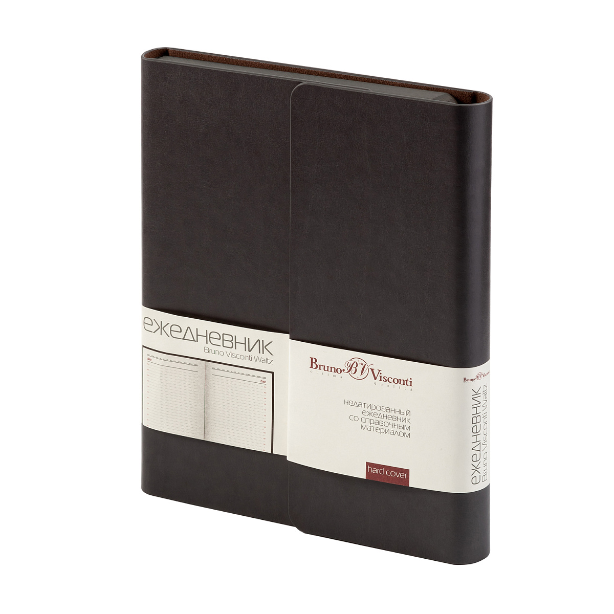 Папка-ежедневник из коллекции "Waltz" порадует любителей нестандартных решений и качественных, стильных деловых аксессуаров. Внутри твердой обложки с магнитным клапаном находится недатированный ежедневник формата А5, закрепленный классическим книжным переплетом. Там же предусмотрена удобная петля для ручки. Материал обложки - искусственная кожа. Бумага - офсет повышенной плотности бежевого цвета. Страницы разлинованы на графы с интервалом в час для четкого планирования дня. Есть раздел со справочной информацией на 18 страницах (Часовые пояса, аэропорты Европы, телефонные коды, температура, единицы измерения, формат бумаги, термины международной торговли, давление, буквенные коды стран, автомобильные коды РФ и СНГ, размеры одежды, скорость, энергетическая ценность продуктов, распад алкоголя в крови, расход калорий при физической нагрузке, города миллионники, страны мира,). На внутренней стороне обложки сделаны вырубки под пластиковые карточки