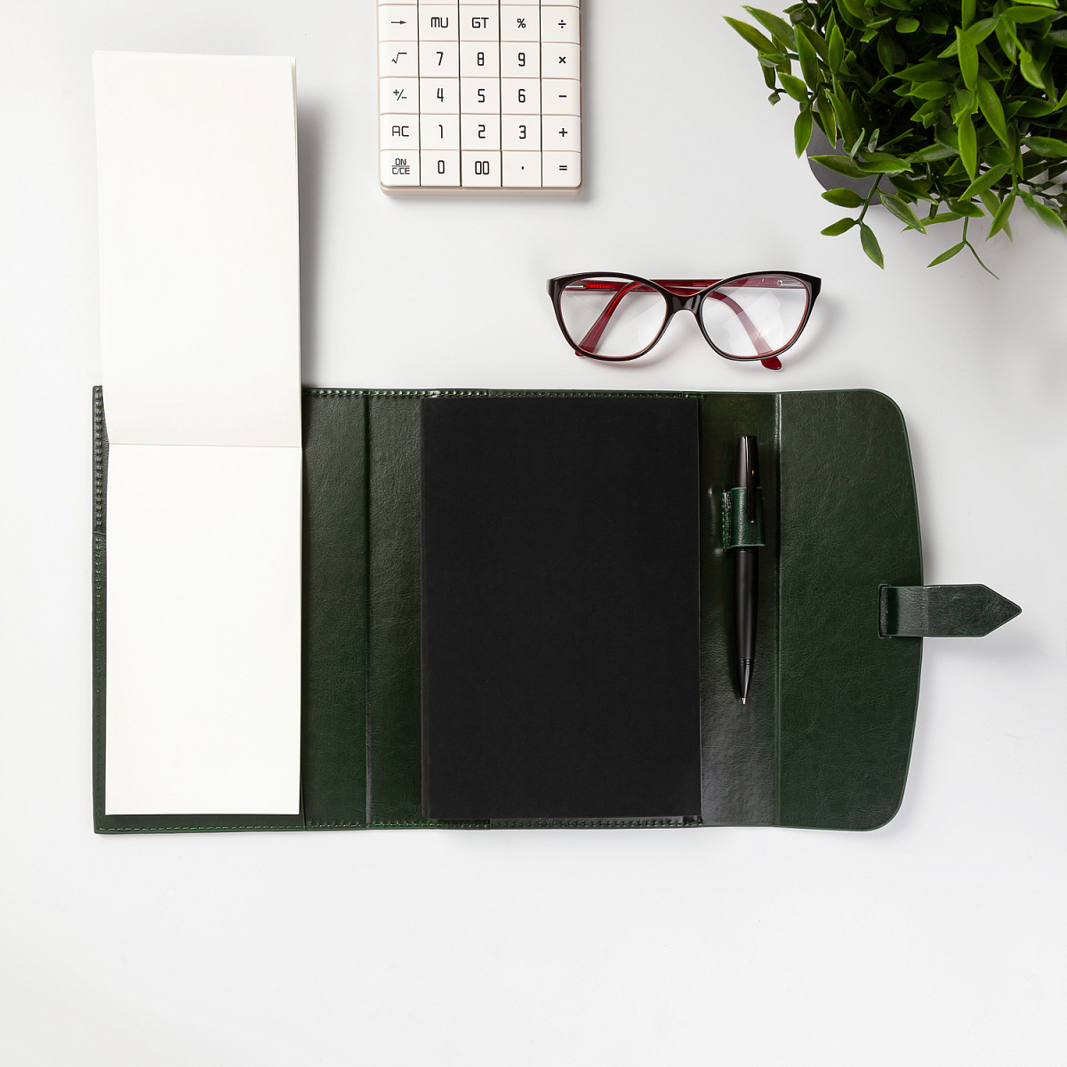 Ежедневник содержит недатированный сменный блок-портфолио формата А5, блокнот вертикального открывания и крепление для ручки.