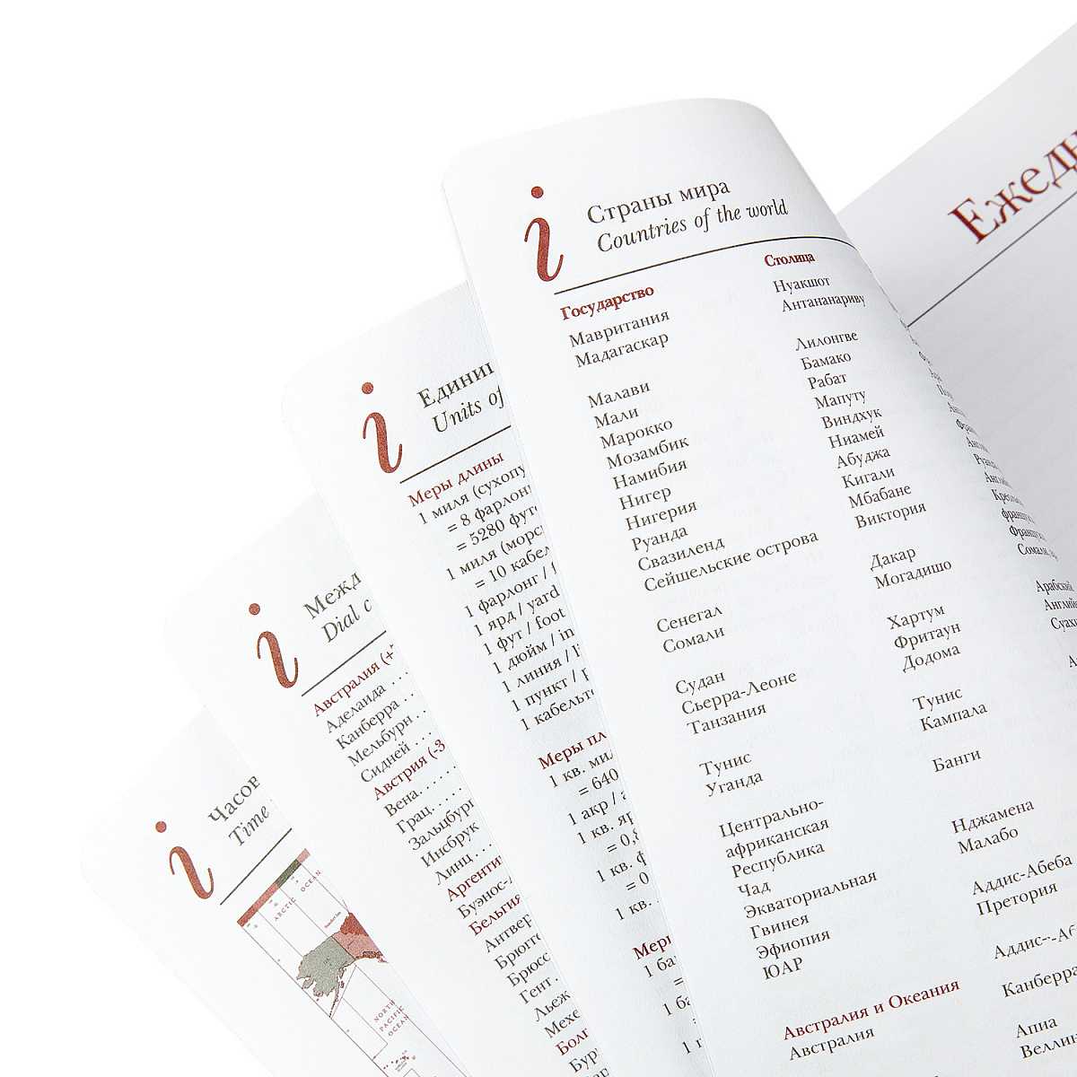• справочной информации на 13 страницах (часовые пояса, аэропорты Европы, телефонные коды, формат бумаги, штрихкоды, религиозные праздники, единицы измерения, страны мира, температура);