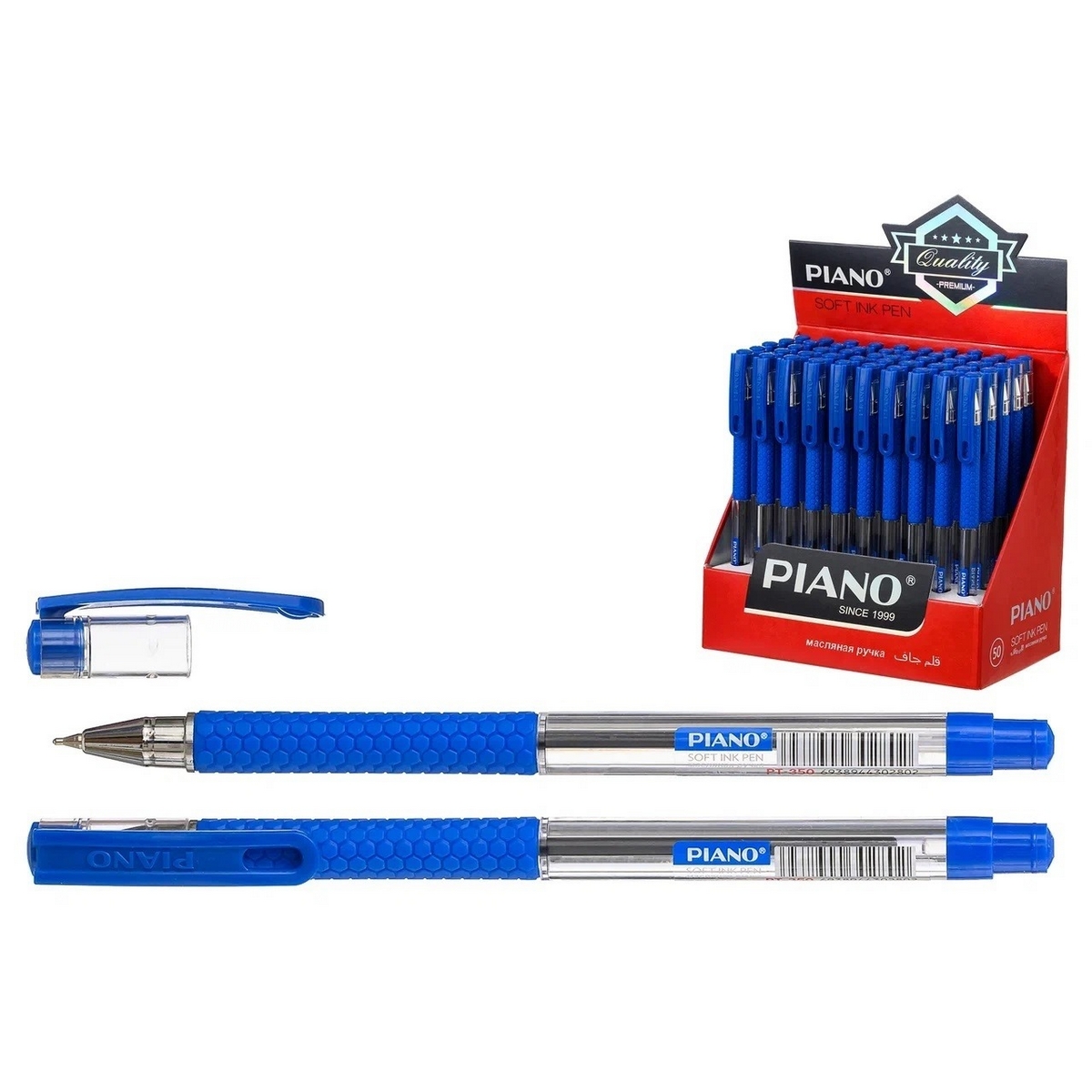 Ручка шариковая: на масляной основе: "Piano"; пластиковый прозрачный корпус, резиновый держатель, прозрачный колпачок с цветным клипом, цвет чернил синий, 0,7 mm.