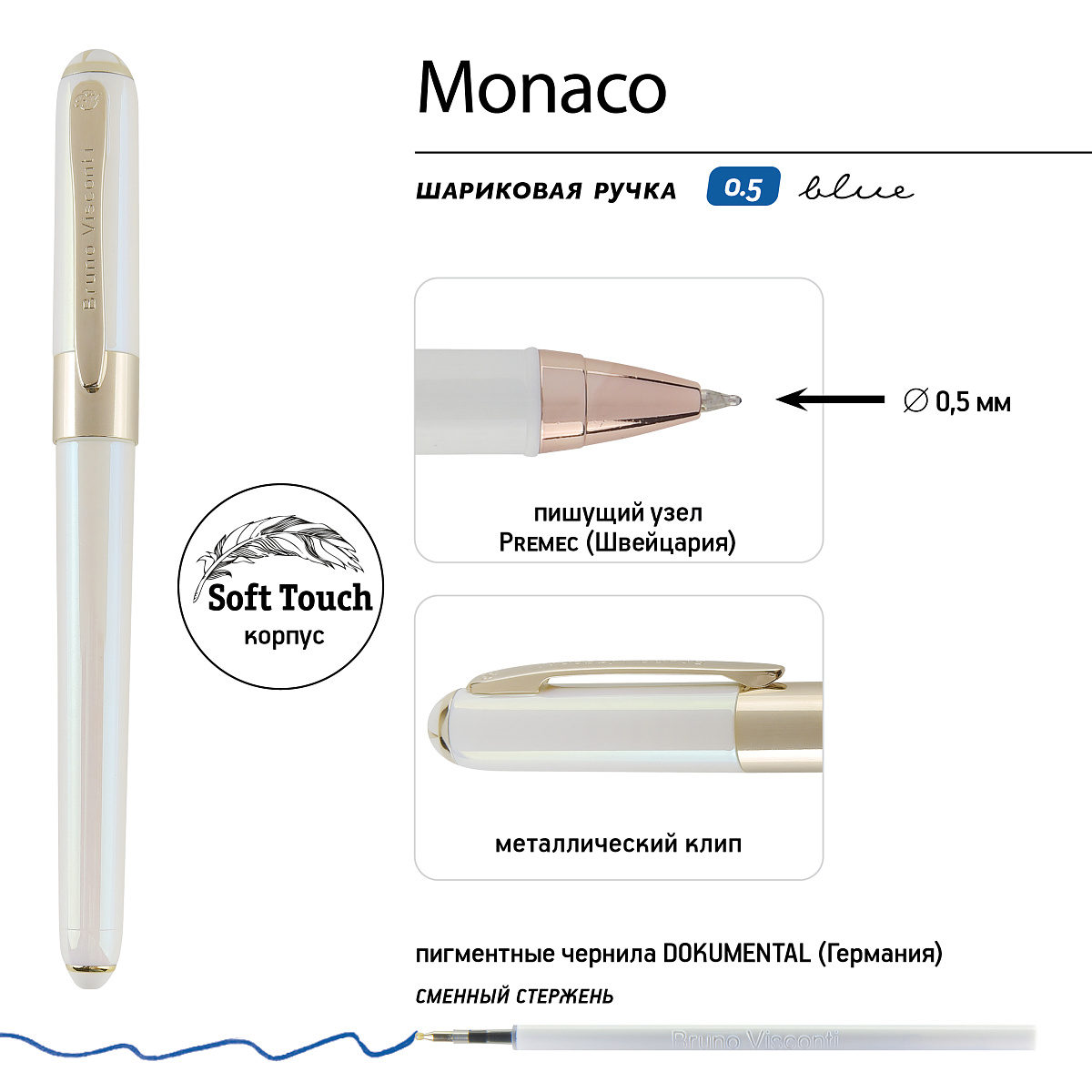 Ручки «Monaco» от Bruno Visconti для тех, кто ценит качество, основательность и продуманность каждой детали. В ней нет ничего лишнего, но она привлекает к себе внимание. Несмотря на увеличенный диаметр корпуса - 12 мм, она изящна благодаря плавным линиям. Чернила Dokumental (Германия) и швейцарский пишущий узел Premec –гарантируют качество и не подведут при подписании судьбоносных документов. Ну а покрытие корпуса Soft Touch создаст комфорт при письме. Встретив ручку «Monaco» однажды – уже не захочется с ней расстаться.