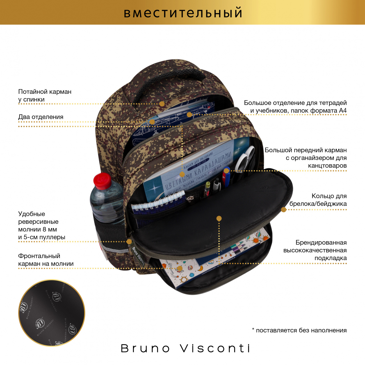 Комфорт и функциональность обеспечивают: эргономичная, вентилируемая, с анатомическими вставками спинка; широкие регулируемые лямки анатомической формы; большое отделение для тетрадей и учебников; отделение для тетрадей с органайзером; ручка-подвес из надежного материала, устойчивого к истиранию с усиленным креплением, выдерживающая большие нагрузки; мягкая эргономичная ручка; по два светоотражающих элемента на лямках и боковых карманах; усиленное дно рюкзака оснащено резиновыми ножками, защищающими от загрязнения и влаги; кольцо для брелока/бейджика; фиксатор лямок; потайной карман для магнитной карты;