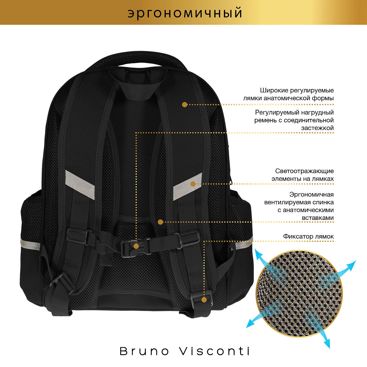 эргономичная, вентилируемая, с анатомическими подушечками спинка;