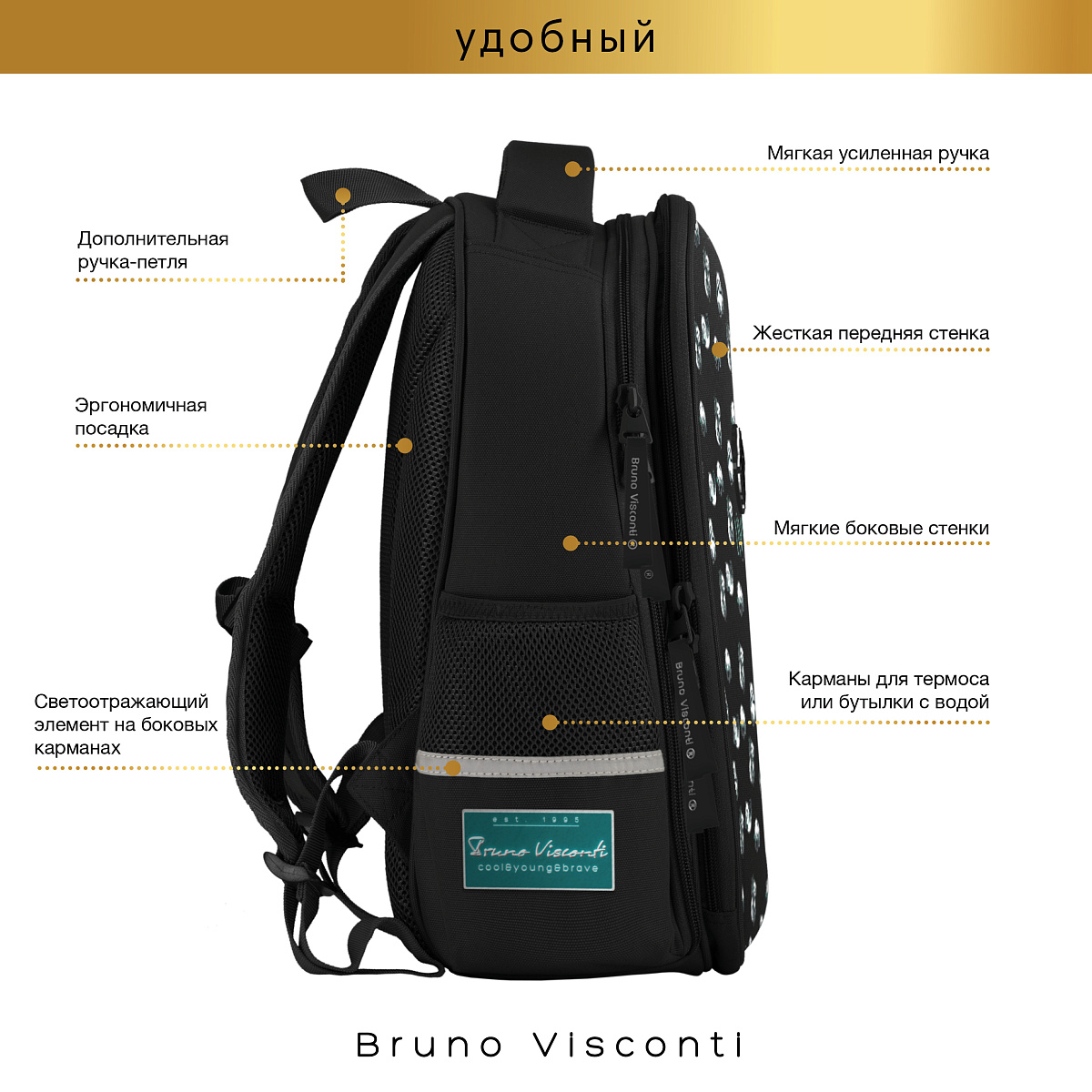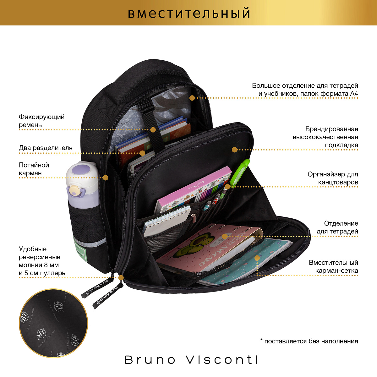 Благодаря сложнейшим современным технологиям нанесения на ткань рюкзак украшает авторский дизайн, соответствующий последним трендам. Плотная фирменная подкладка BRUNO VISCONTI идеально сочетается с дизайном и цветом самого рюкзака.