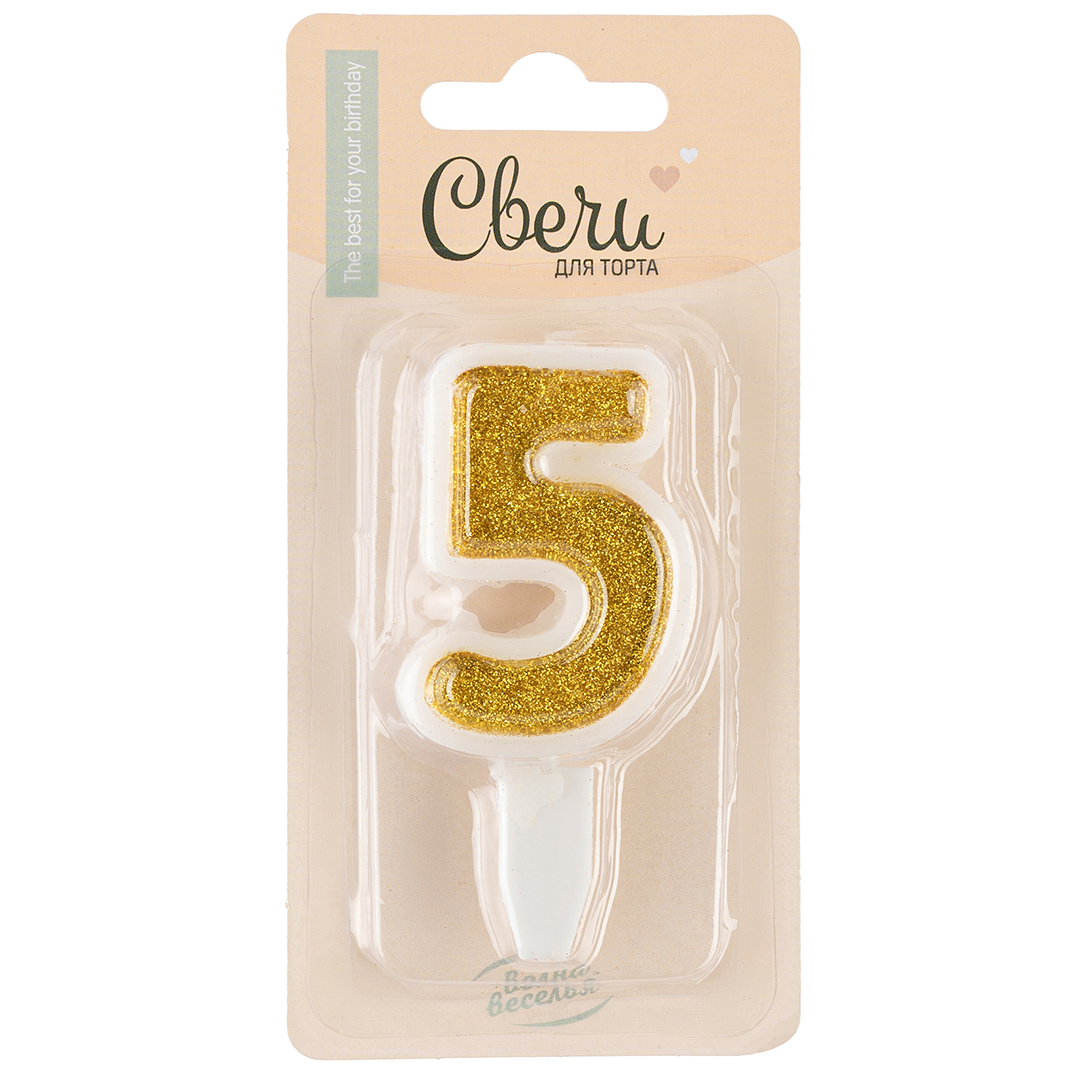 Свеча д/торта "Цифра 5" золото с блестками, 5см., держатель, блистер