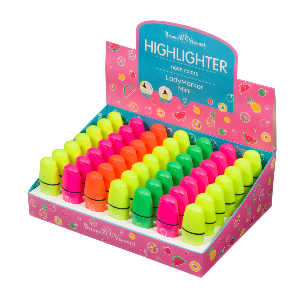 Маркер - текстовыделитель LadyMarker Mini не оставит равнодушным ни юных школьниц, ни офисных сотрудниц. Компактный округлый корпус удобно лежит в небольшой руке. Дизайнерские принты на корпусах маркеров добавляют очарования и вносят приятное разнообразие в школьные и офисные будни. Чернила ярких неоновых цветов, которые никогда не выйдут из моды, подходят для выделения текста на любой бумаге. Плотно защелкивающийся вентилируемый колпачок предохраняет чернила от высыхания. Клиновидный пишущий узел позволяет проводить линии от 1 до 5 мм шириной в зависимости от угла наклона. Прочный, износоустойчивый наконечник гарантирует постоянство толщины линии на протяжении всего срока службы. Чернила на водной основе обладают повышенной светостойкостью и сроком годности.