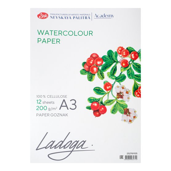 Папка с бумагой для акварели "Ладога", А3, 200 г/м2, 12 л, 100% целлюлоза, среднее зерно