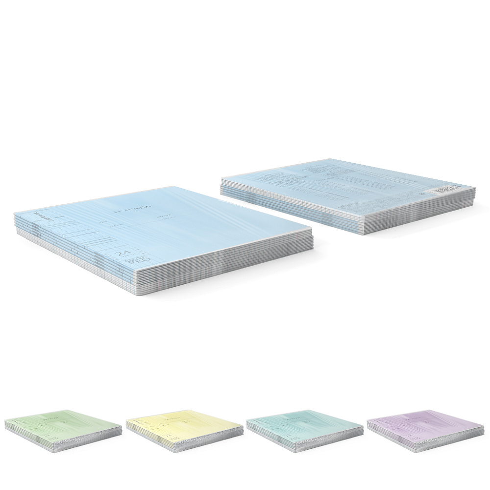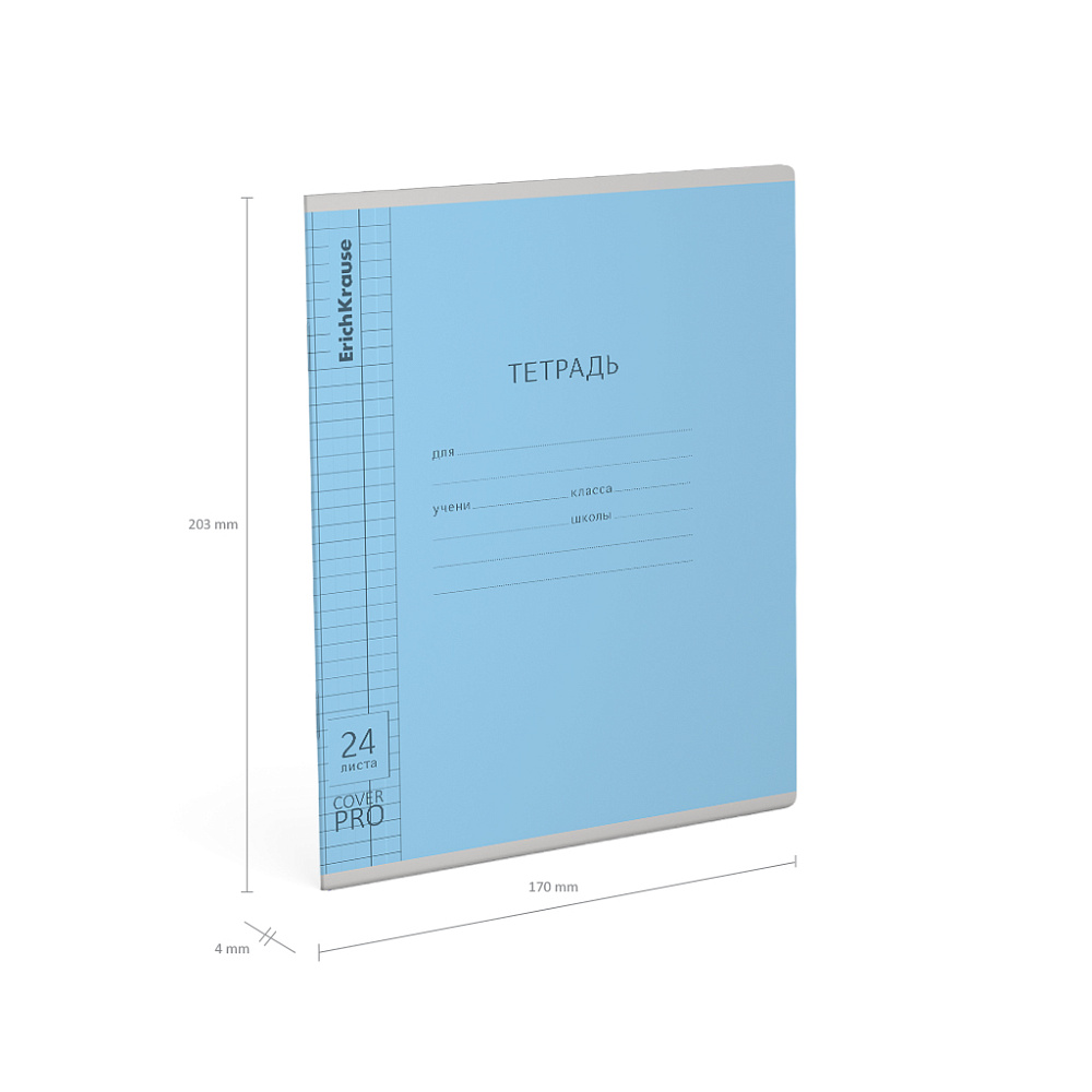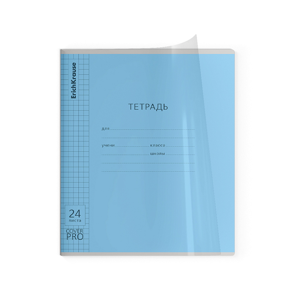 Тетрадь школьная ученическая формата А5+ (170x203 мм). Двойная обложка: внешняя выполнена из высококачественного износостойкого прозрачного пластика с фактурой «зеркало», внутренняя — из качественной мелованной бумаги. В блоке 24 листов в клетку. Бумага офсетная плотностью 60 г/м2. Цвет линовки — синий. Скругленные уголки обложки и блока. Тип скрепления — скоба. Тетради разных цветов упакованы в термоусадочную пленку по 10 штук.