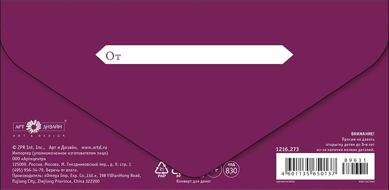| Вид товара: | конверт |