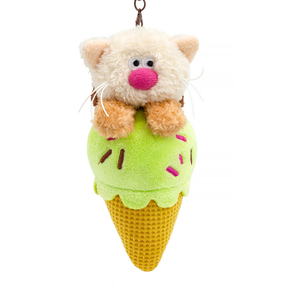 Забавный брелок в виде милого котёнка Капучино из тактильно приятного эко меха в трёх оттенках: шоколадного, кремового и молочного цвета. Котёнок удобно устроился на рожке фисташкового мороженого. Мороженое сшито из вафельной ткани цвета печенья, имитирующей вафельный рожок, и софта цвета фисташки с вышитой карамельной посыпкой. У брелока удобный карабин шоколадного цвета с застежками, который можно отстегнуть.