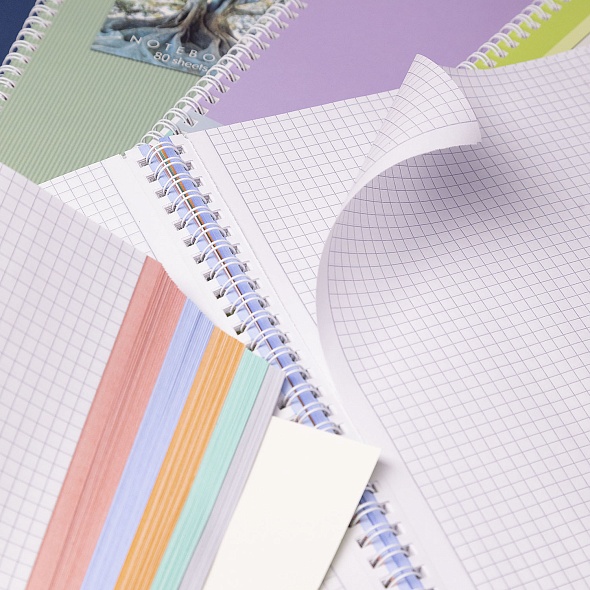 Тетрадь А4 формата 80 листов. Обложка: мелованный картон, глянцевая ламинация. Внутренний блок: офсет 65 гкв.м., клетка, многоцветный срез, многоуровневая перфорация. Скрепление: гребень. Тетрадь предназначена для записей, используется студентами и в офисе. Перфорация на отрыв имеет засечку для более удобного использования. Скрепление 'гребень' дает возможность раскрывать тетрадь на 360 градусов, а твердая обложка позволит делать записи на весу. Многоцветный срез помогает разделять записи по тематическим рубрикам.