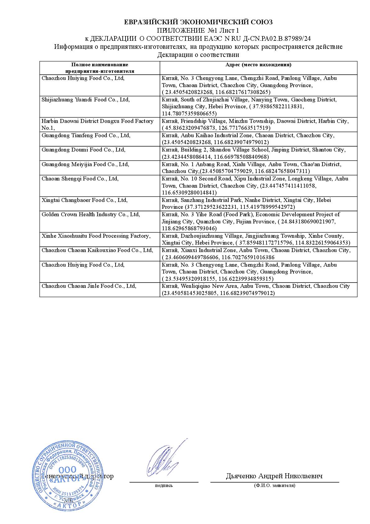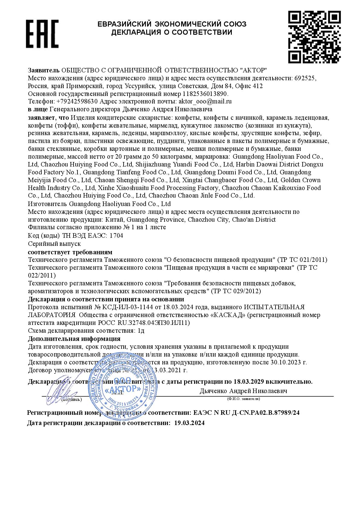 | Описание для этикетки: | Конфета жевательная Состав: Сахар, мальтозный сироп, вода, лимонная кислота , пищевые добавки. Энергетическая и пищевая ценность (на 100гр): 359 Ккал / Белок- 0 г Жиры- 3,1 г Углеводы- 81,7 г Срок годности: 12 месяцев. Дата производства: см. на упа.Хранить в прохладном и сухом месте. Избегать попадания прямых солнечных лучей. Импортер: ООО "Актор", адрес: г. Уссурийск, ул. Советская 84 Изготовитель: Guangdong Yixiang Food, адрес: Anbu City Chaoan District Chaozhou City Соответствует требованиям: ТР ТС 029/2012 Требования безопасности пищевых добавок, ароматизаторов и технологических вспомогательных средств. ТР ТС 021/2011 О безопасности пищевой продукции. ТР ТС 022/2011 Пищевая продукция в части ее маркировки |