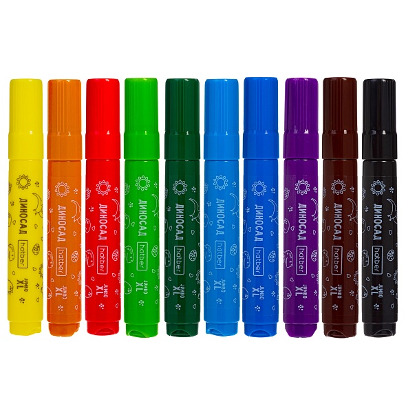 Фломастеры Hatber JUMBO-XL ДИНОСАД 10 цветов с одним из самых толстых корпусов в своём классе - диаметром 19мм.Утолщённая форма корпуса, позволяет ребёнку удобно держать фломастер в руке. Корпус из полипропилена устойчив к разлому, - безопасен при попытке сломать. Чернила фломастеров изготовлены на водной основе, не имеют запаха, безопасны, легко смываются с рук и одежды с помощью воды и мыла. Штрихи и линии не проступают на обратную сторону листа. Толстый наконечник, диаметром 6мм, выдерживает сильный нажим и не проваливается внутрь корпуса.Колпачок имеет специальные прорези для вентиляции, которые способствуют прохождению воздуха при случайном попадании в дыхательные пути ребёнка. При этом колпачок плотно закрывается, обеспечивая долгий срок службы фломастера.