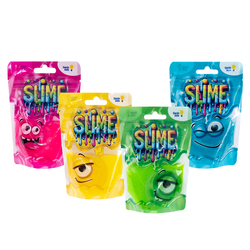 Слайм в устойчивом зип-пакете. Четыре цвета в аасортменте: розовый, зеленый, голубой, желтый. Цвет пакета соответсвует цвету слайма внутри. Объем 100 грамм.