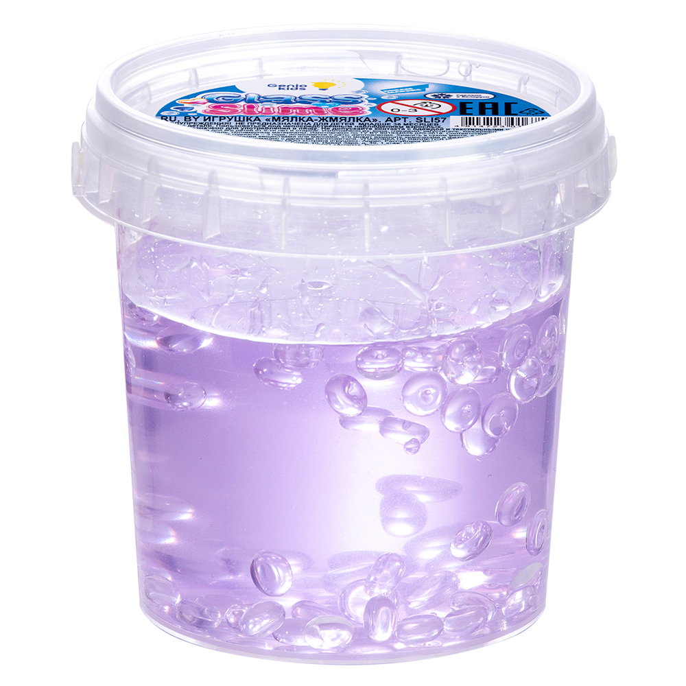 Слайм ПВС бледно-фиолетового цвета, номинальный объем 100г с добавлением фишболов (10г) - глянцевых шариков прозрачного цвета, придающиех дополнительную текстуру, а также для создающих характерный звук.