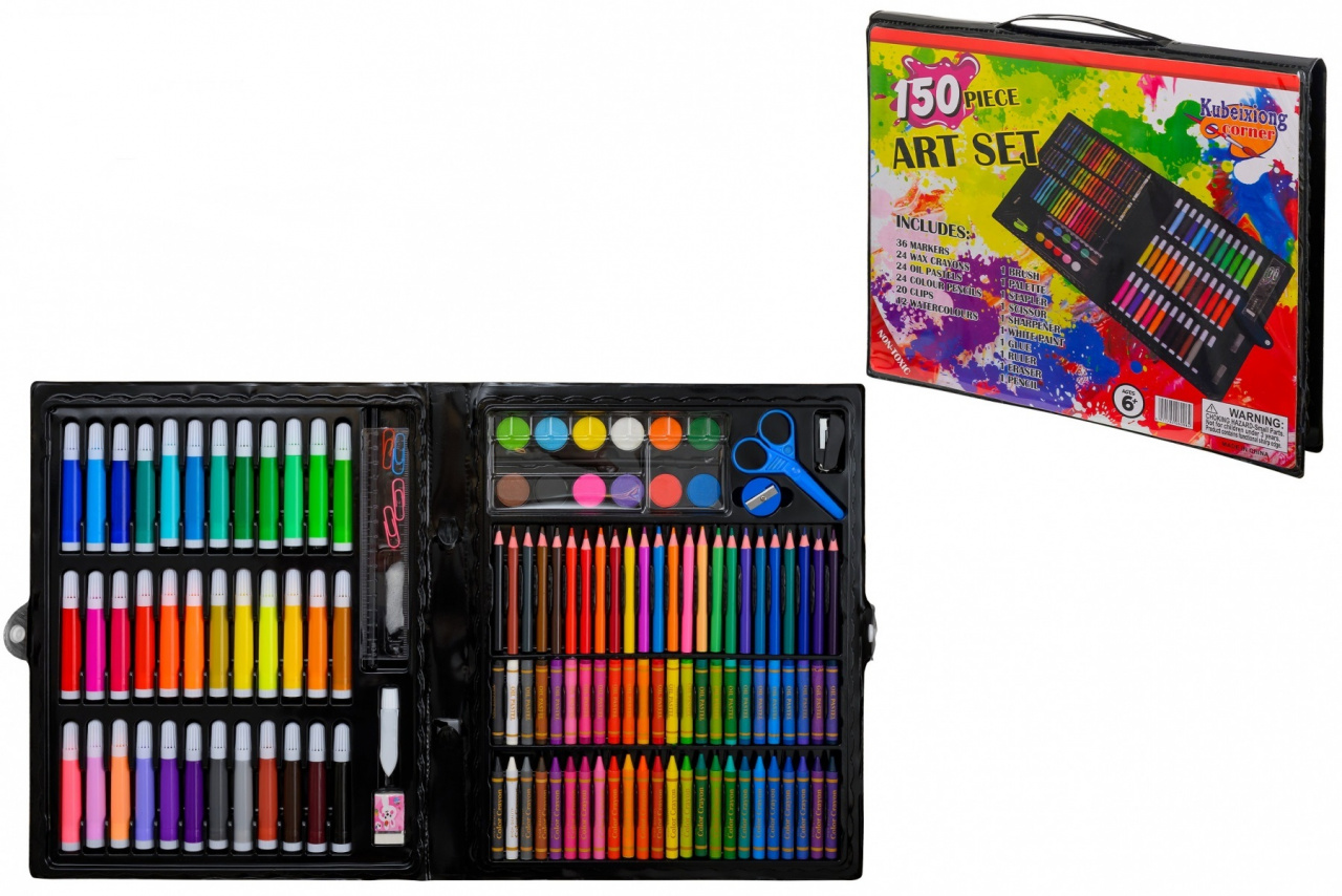 Набор для детского творчества: в виде папки-портфеля на кнопке; 150 предметов: цветные карандаши, восковые мелки, пастель, ч/г карандаш, фломастеры, краски, линейка, ластик, точилка, губка, скрепки, ножницы, мини степлер, кисть, клей, палитра.