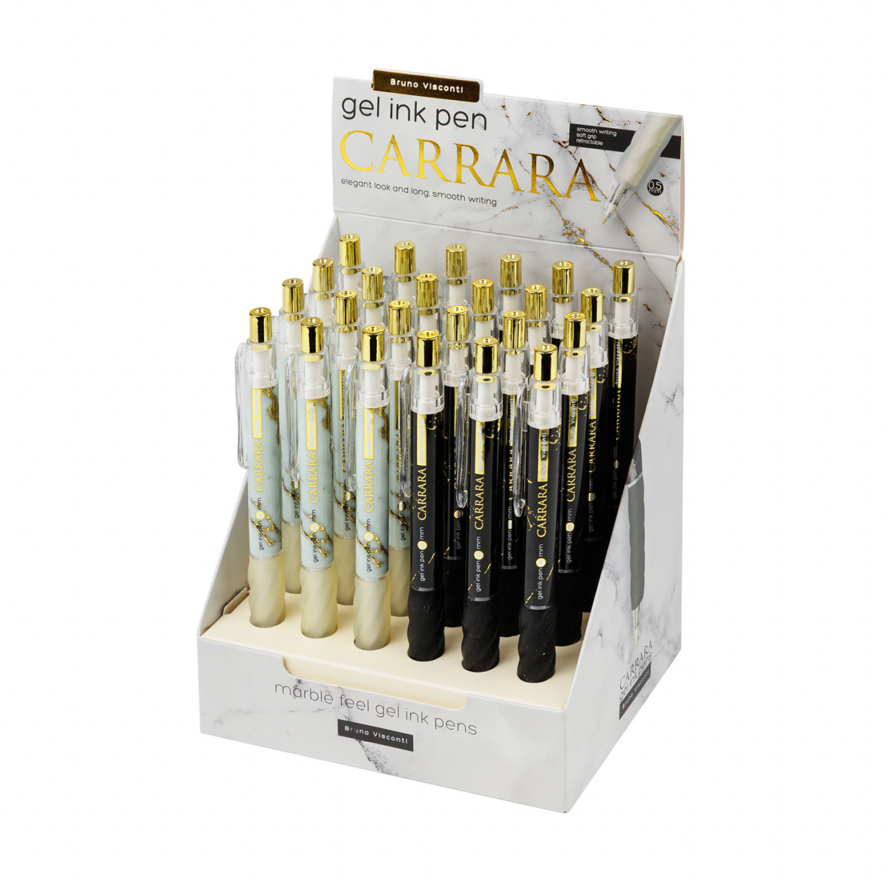 Гелевая автоматическая ручка «CARRARA» от Bruno Visconti — обладательница японских чернил Mikuni и полуигольчатого пишущего узла диаметром 0,5 мм, благодаря которым ручка легко скользит по поверхности бумаги, оставляя тонкую линию.