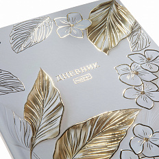 Обложка: картон 320 г/м2, печать 4+4, ламинация, скругление углов. Спираль сбоку. Внутренний блок: офсетная печать, бумага 100% белизны, 65г/м2. Дизайн внутреннего блока "в клетку". Особенности: тиснение золотой фольгой.