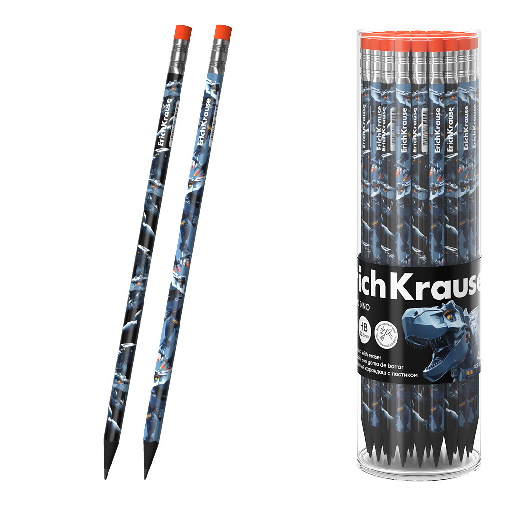 Карандаш ERICH KRAUSE "Techno Dino" HB с ластиком, трехгранный, чернографитный, тубус