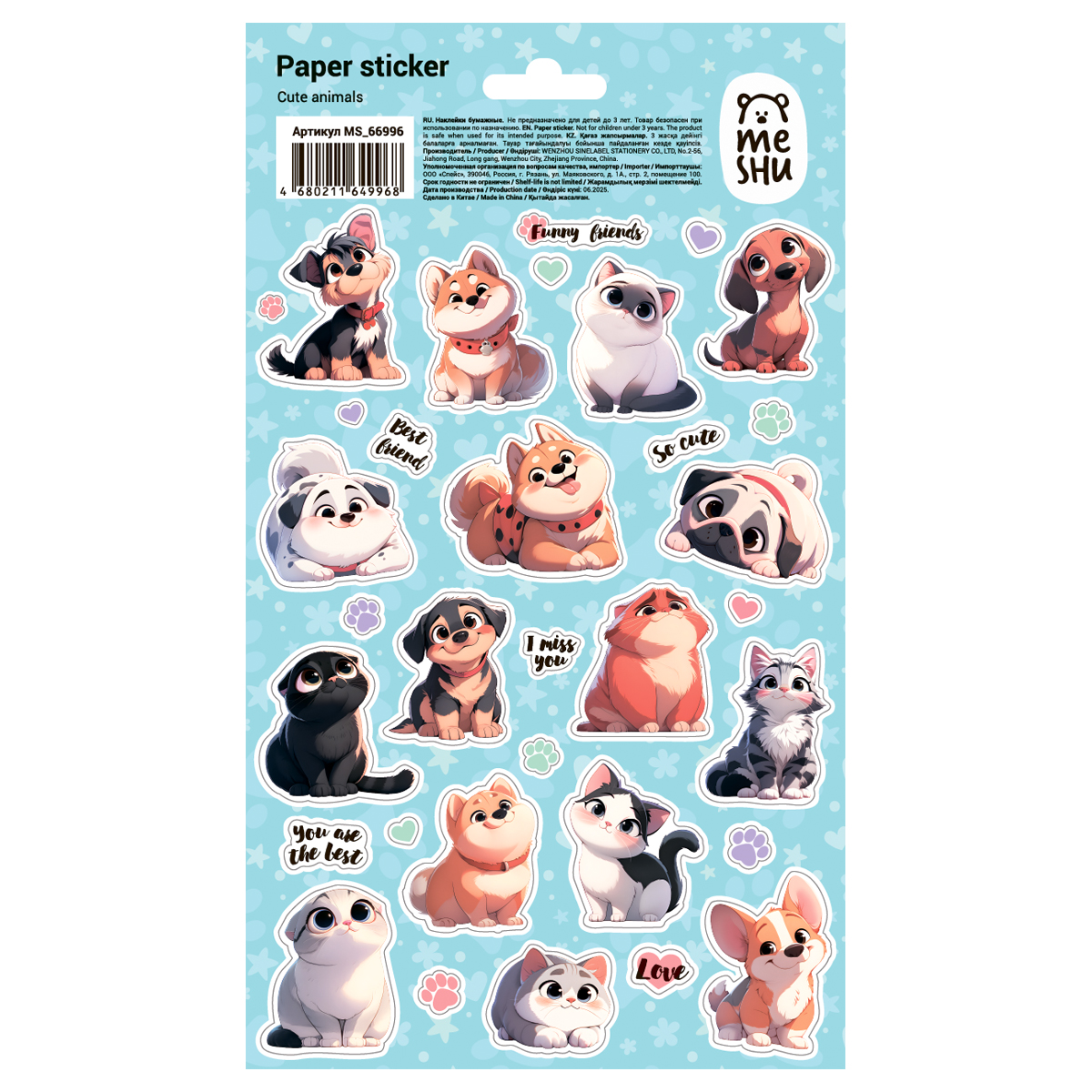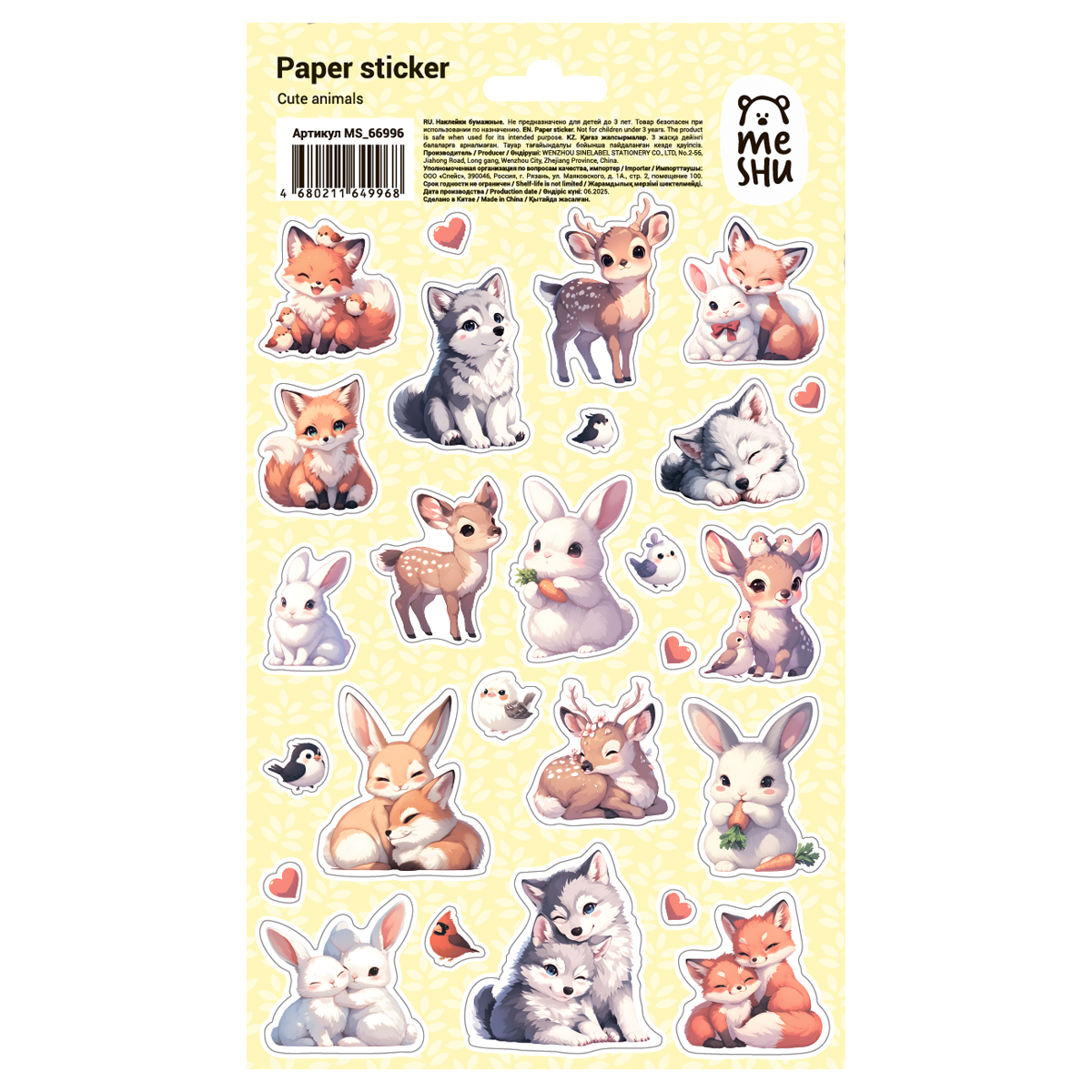 Наклейки бумажные MESHU "Cute animals", 12*21см, ассорти 10шт., европодвес