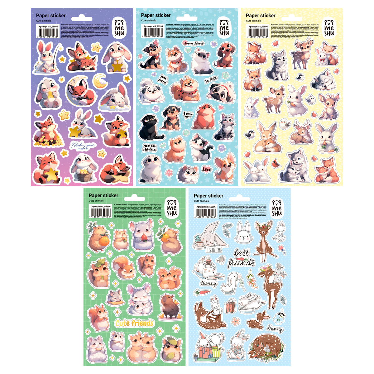 Набор наклеек Meshu А5 "Милые животные" 10 листов, пакет, европодвес