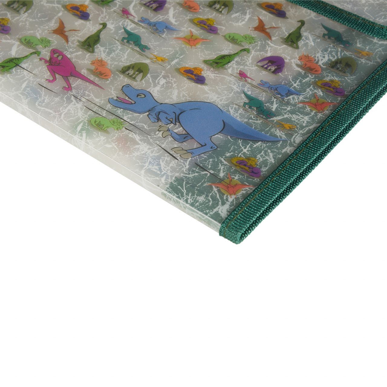 Папка-конверт на кнопке авторского дизайна из коллекции «Динозаврики» формата А4 для хранения и транспортировки тетрадей, различного типа документов. Папка изготовлена из полупрозрачного прочного полимерного материала толщиной 0,4 мм с текстильной окантовкой. Не царапается, не расходится по швам.
