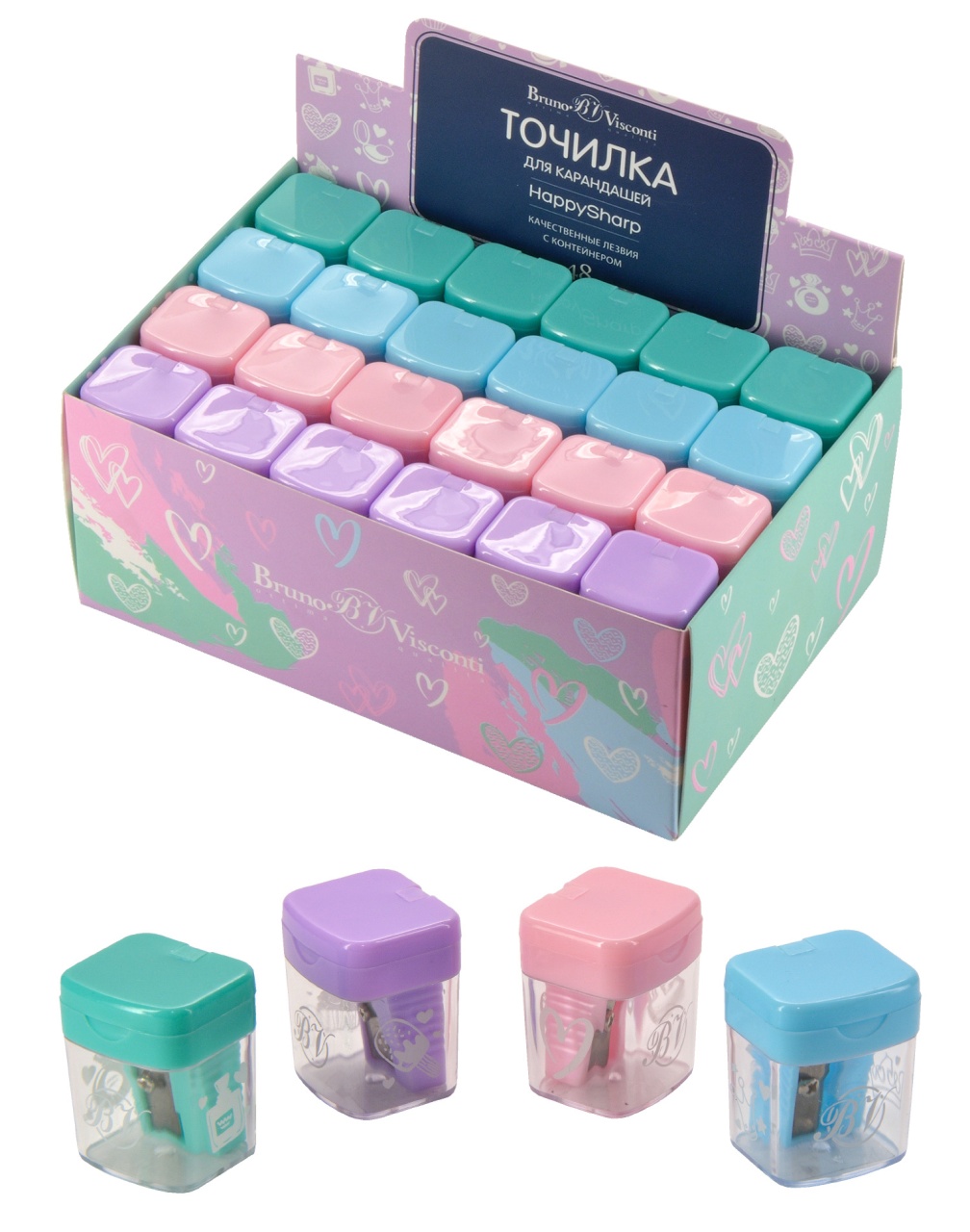 Точилка Bruno Visconti "Happy sharp Девичьи радости" 1 отверстие, с контейнером, 4 цвета