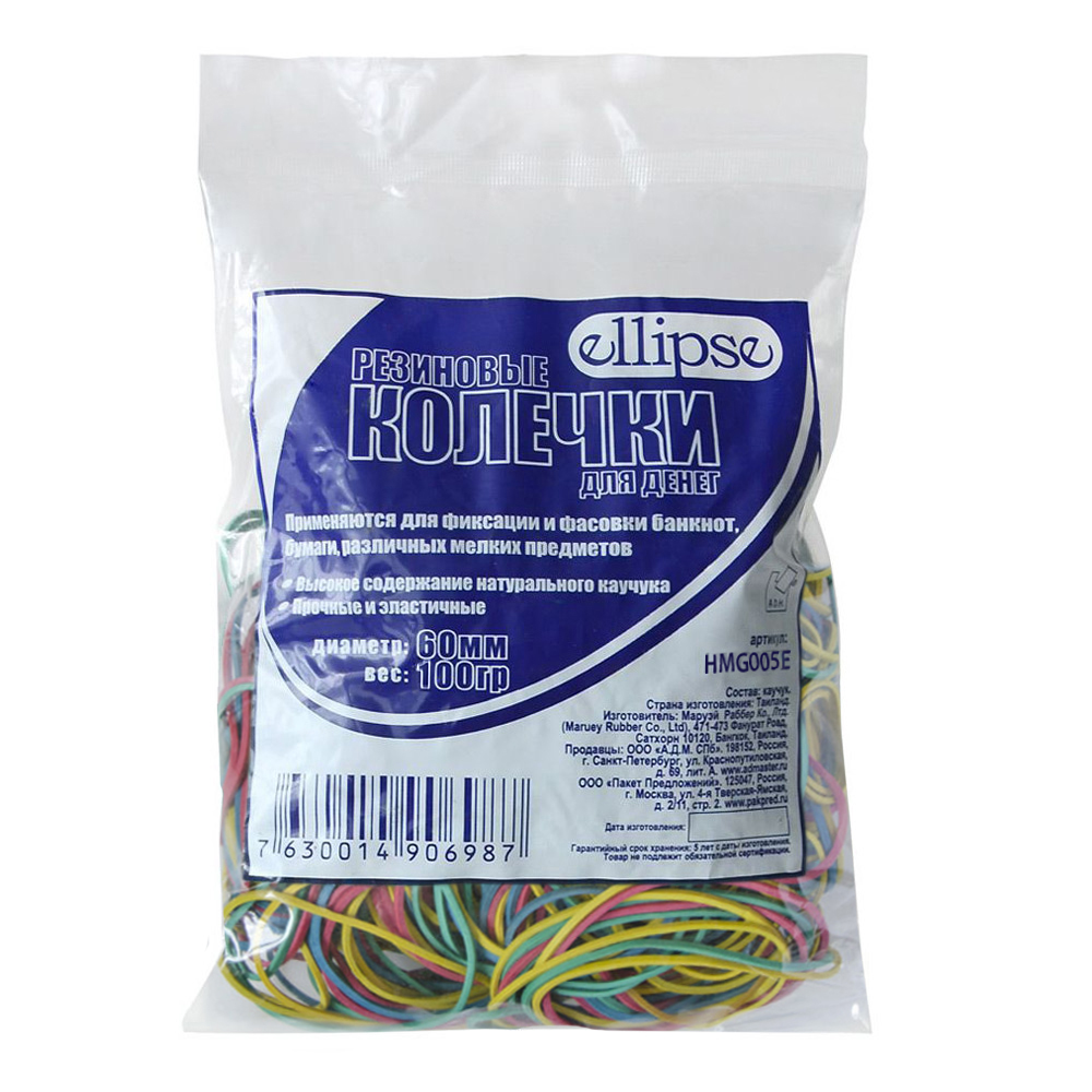 Колечки резиновые для денег торговой марки «Ellipse» изготовлены из высококачественного каучука с различными добавками (содержание каучука не менее 60 %). Поставляются различных диаметров:30, 40, 50 и 60 мм, в нескольких цветовых исполнениях: синие, зеленые, красные, mix.
