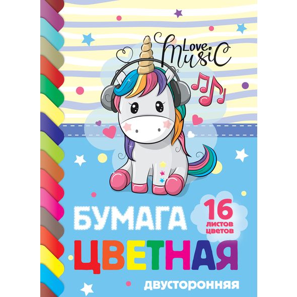 Цветная бумага А4 ХАТБЕР 16л./16цв. "I Love Music" двухсторон., "есо" на скобе