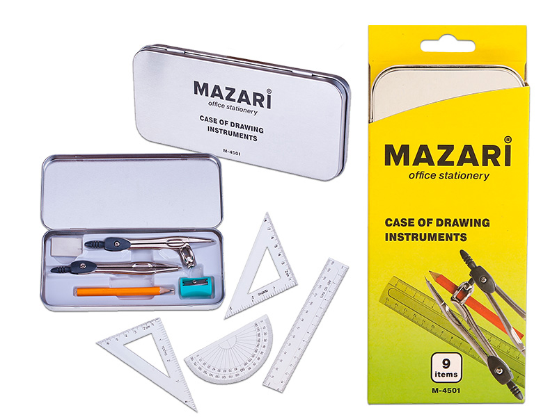Готовальня Mazari 9пр. 2 циркуля, 2 угольника, линейка, транспортир, карандаш, точилка
