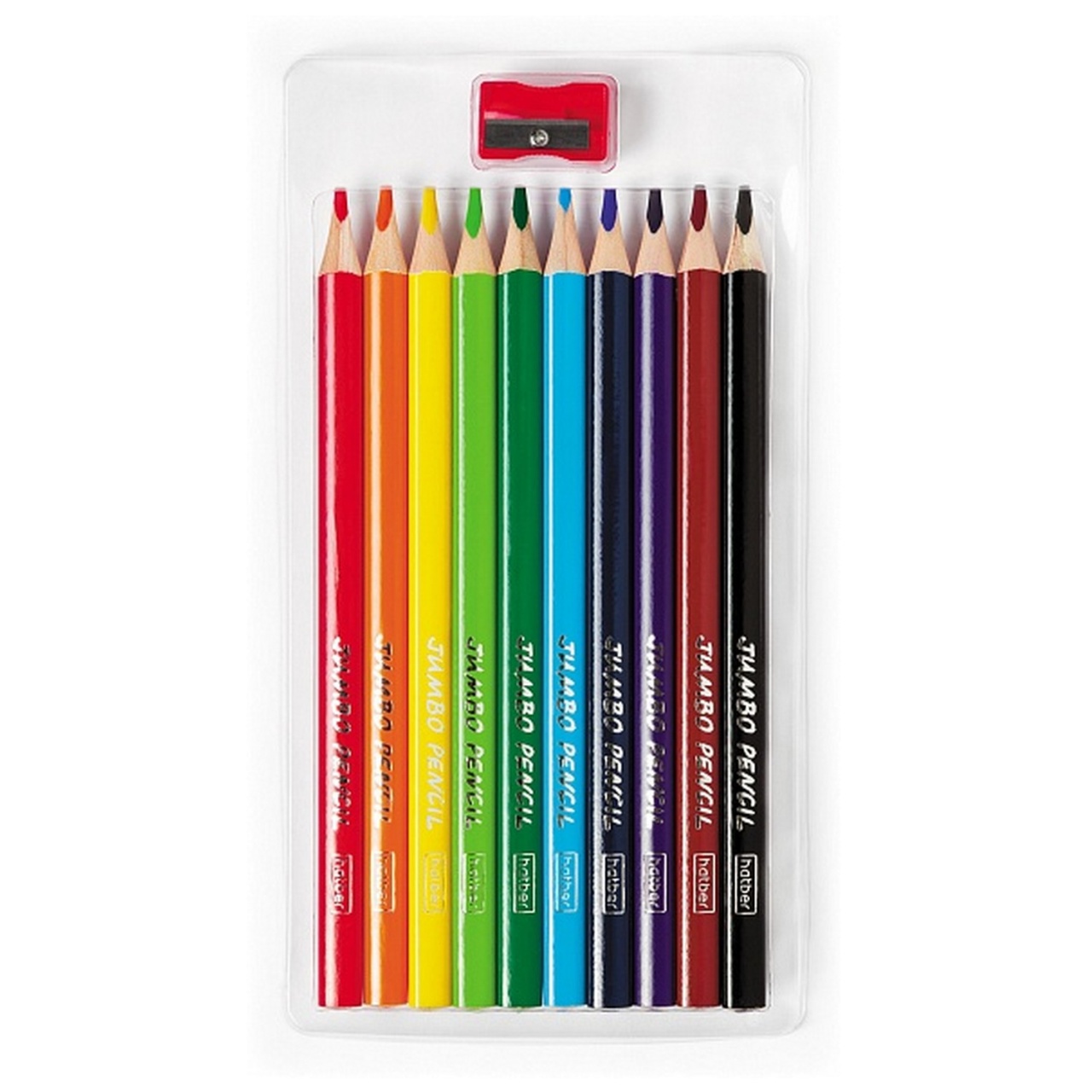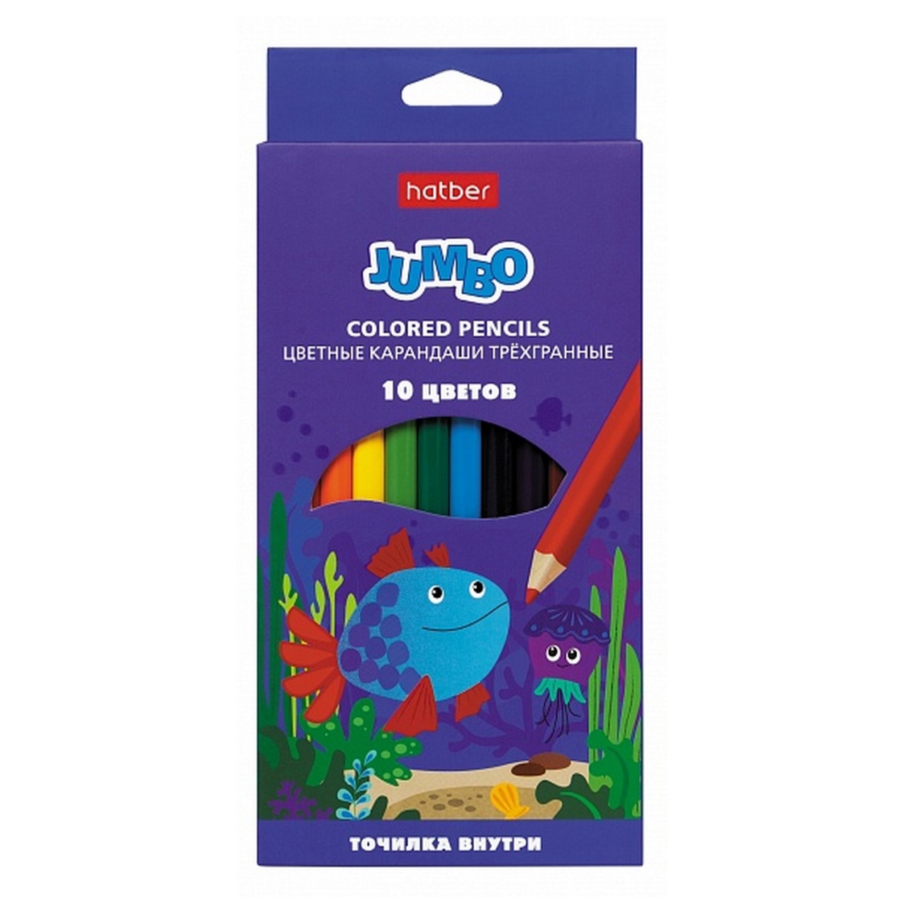Карандаши цветные 10 цветов Hatber Jumbo с утолщенным трёхгранным корпусом и насыщенной цветовой гаммой. Трехгранная форма корпуса снижает нагрузку на руку и придаёт дополнительный комфорт. Прочный неломкий грифель толщиной 4мм имеет превосходную мягкость, оставляет плотный выразительный след на поверхности бумаги. Набор поставляется в картонной упаковке с вырубным окошком и европодвесом. Карандаши внутри коробки уложены в удобный пластиковый поддон, в котором также находится пластиковая точилка, подходящая по размеру для затачивания утолщенного корпуса.
