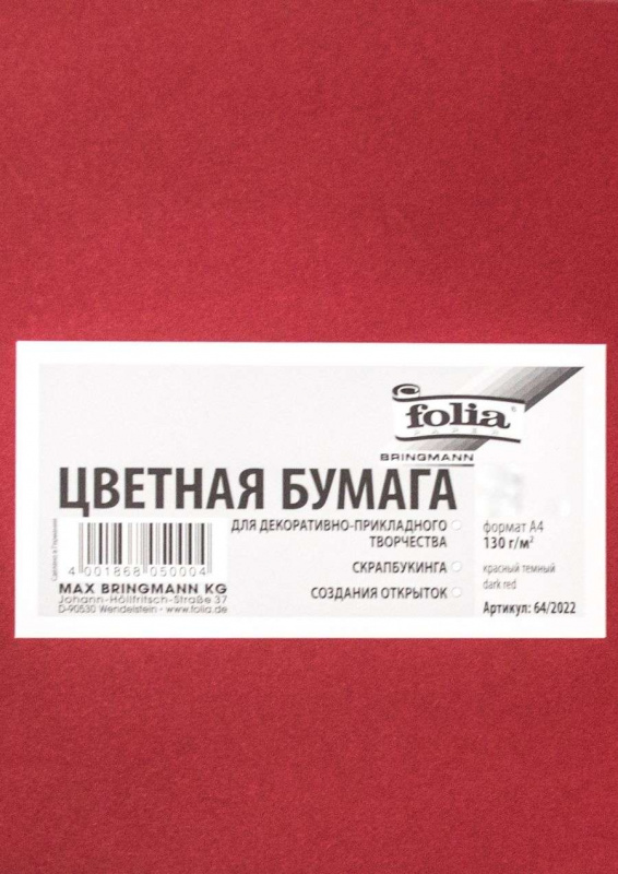 Бумага цветная Folia А4 красный темный, 130г/м2.