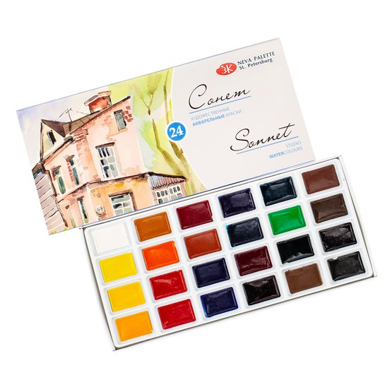 Художественные акварельные краски "Сонет" разработаны для начинающих художников, открывающих или совершенствующих свои творческие способности. Изготавливаются по современным рецептурам на основе преимущественно органических пигментов и синтетического связующего. Обладают интенсивностью цвета и прозрачностью. Превосходно смешиваются, размываются и легко берутся на кисть. Тщательно подобранная палитра из 24 цветов акварельных красок "Сонет" позволяет решить множество творческих задач начинающего художника при выполнении учебных работ, этюдов и эскизов.