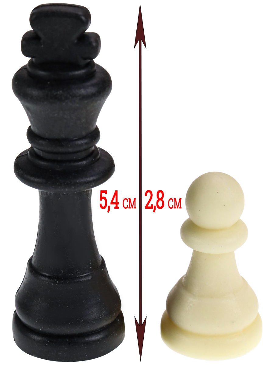 В чем польза шахмат? В том, что шахматы благоприятно влияют на развитие умственных способностей, уже нет сомнений. Польза игры в шахматы многогранна – это отмечали выдающиеся деятели на протяжении многих веков. В шахматы играли политики, философы и ученые, ими увлекались писатели, художники и музыканты. В процессе игры в шахматы идет одновременная работа сразу правого и левого полушария мозга, в гармоничном развитии которых и состоит основная польза шахмат. Стратегическая игра развивает логику, внимательность и усидчивость, планирование, воображение, силу воли, математическое и критическое мышление, работоспособность и выдержку, стрессоустойчивость в любом возрасте. Шахматное поле выполнено из дерева, фигуры - из пластика. В комплект входят: игровое поле, 32 фигуры. Размер доски: 29х14.5х3 см. Размеры фигур: король - 5,4 см, пешка - 2,8см.