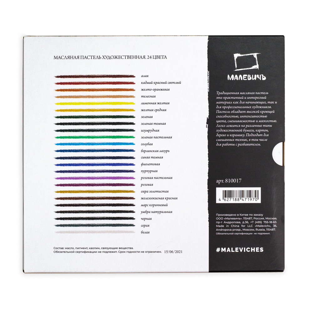 Масляная пастель Малевичъ профессиональная, 24 цвета. Традиционная масляная пастель это практичный и интересный материал как для начинающих, так и для профессиональных художников. Пастель обладает высокой кроющей способностью, интенсивностью цвета, смешиваемостью и мягкостью. Легко ложится на различные типы художественной бумаги. Можно размыть пастель с помощью разбавителя для масляных красок.