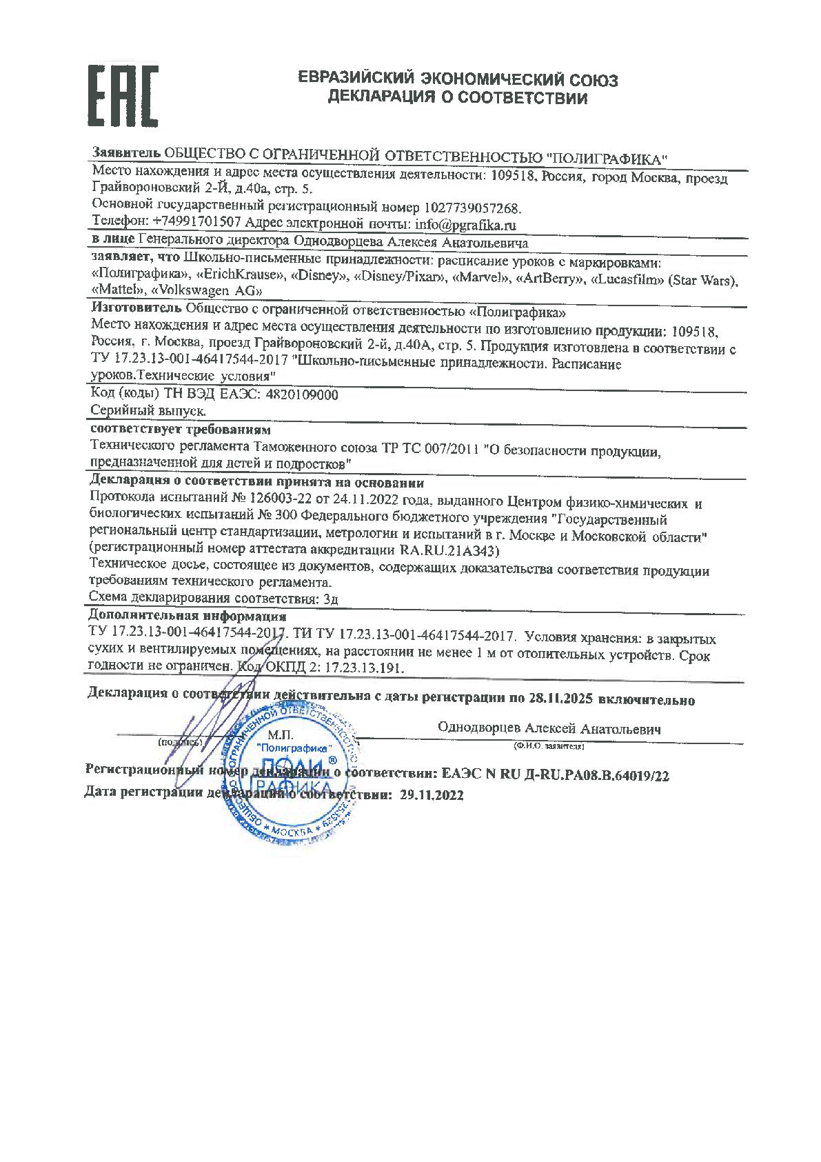 Расписание уроков формата А4 (210х297 мм). Плотный мелованный картон 170 г/м2. Шестидневная учебная неделя. Каждый день содержит 8 строк для записи. Расписания уроков упакованы в термоусадочную пленку по 100 штук.