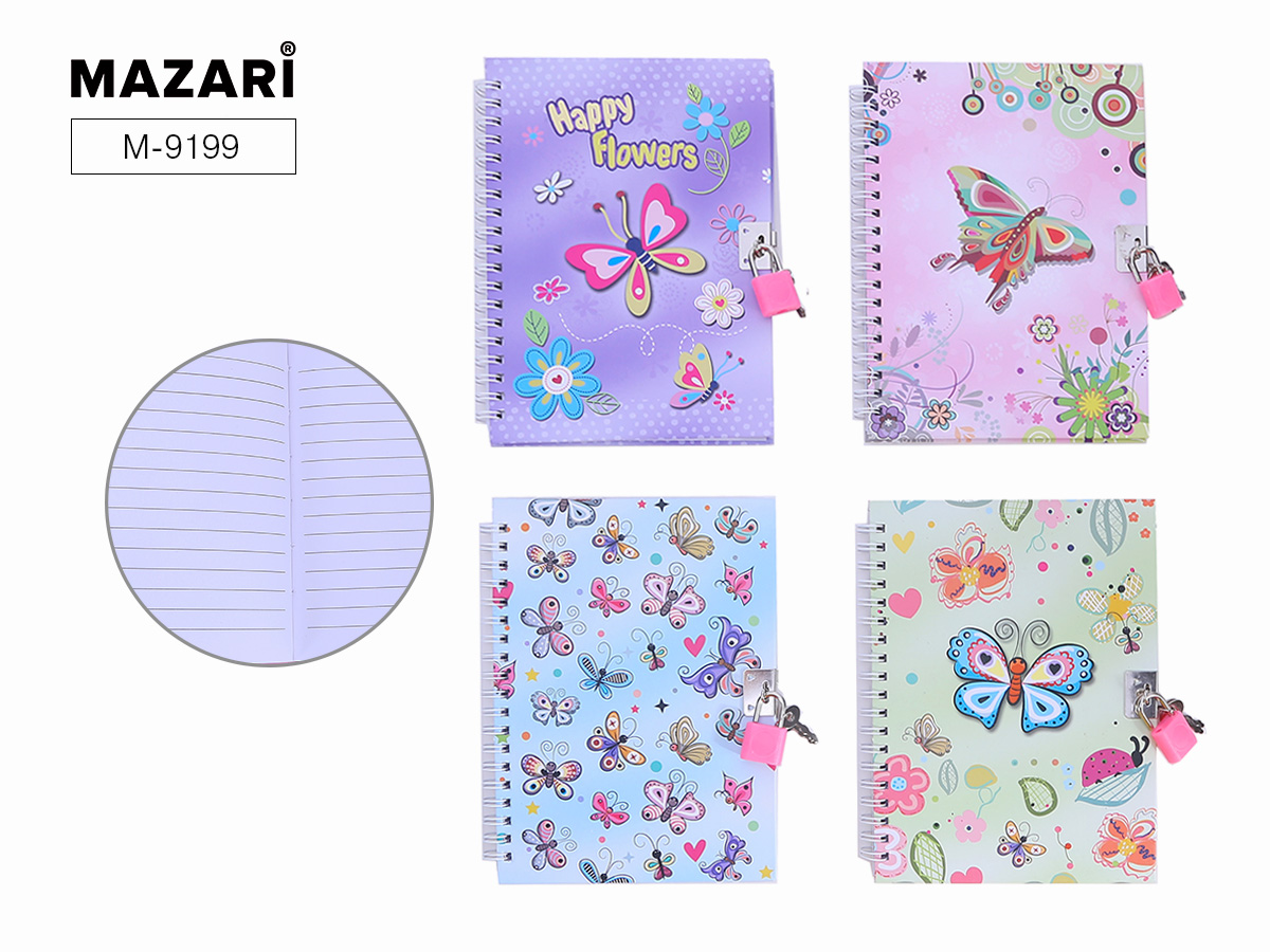 Блокнот А6+ Mazari "Бабочки" 48л., линия, спираль, с замочком, 13*18, 4в.