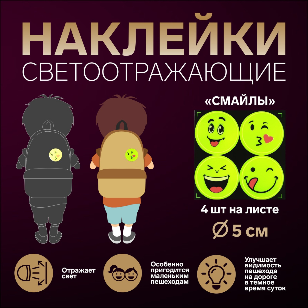 Наклейки Арт Узор "Смайлы" светоотражающие, 4шт., фликеры, 5 см., pvc