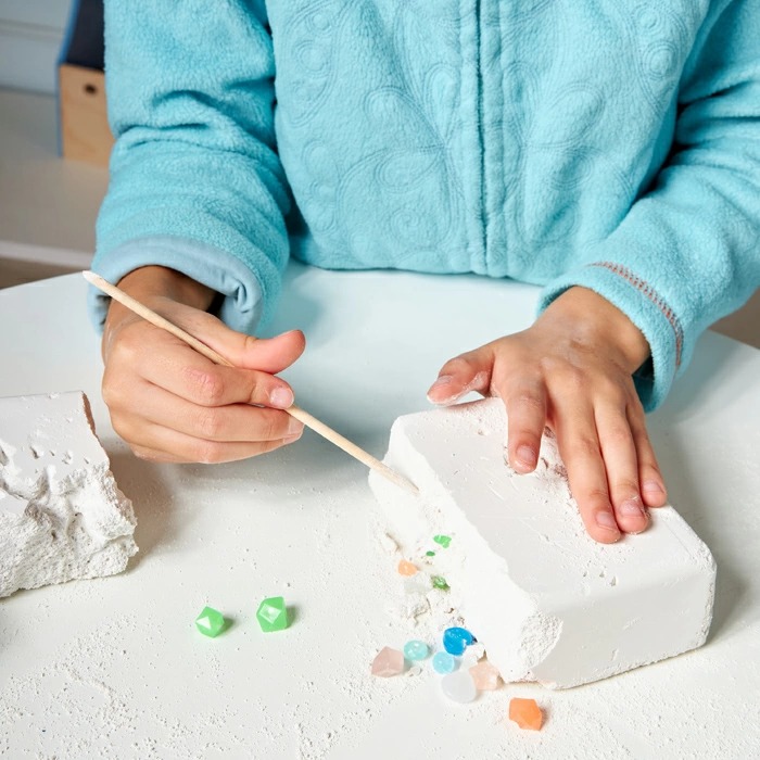Используйте деревянный скребок из набора, чтобы аккуратно разломать гипсовый блок и найти спрятанные светящиеся кристаллы. Каждый кристалл уникален и добавит яркость в твою коллекцию.